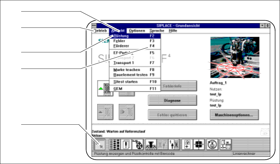2 Einführung und Grundbegr iffe Betriebsanleitung SIPLACE 80S-20/F4/F5 2.2 Grundlagen und Aufbau der Bedienoberfläche Aus gabe 05/99 ab Softwareversion SR.405.xx 2 - 12 2.2.2. 1 Tite lbalken Der Titelbalken zei gt den M …