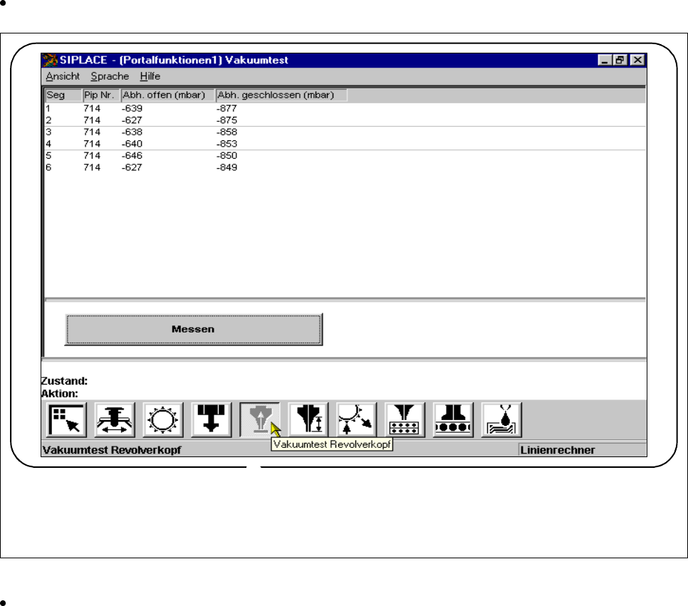 4 Einzelfunktionen Betriebsanleitung SIPLACE 80S-20/F4/F5 4.3 Einzelfunktionen Portal mit 6-er Revolverkopf (nur für 80F5) Ausgabe 05/99 ab Softwareversion SR.405.xx 4 - 34 4.3.4 V akuumtest 6-er Revolverkopf Wenn alle P…