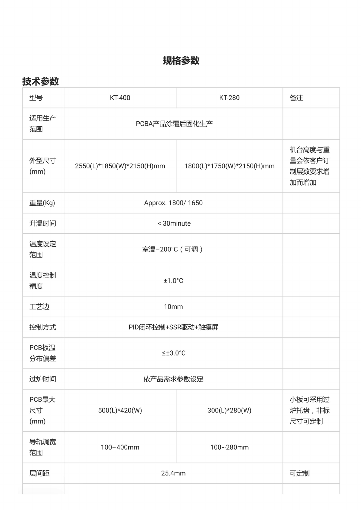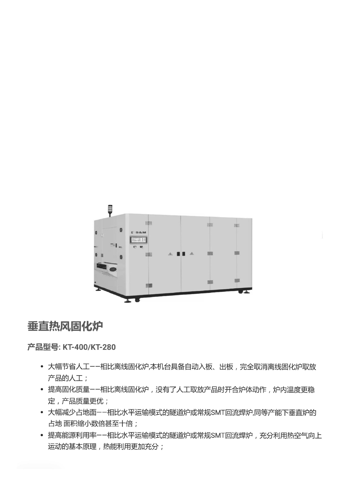 垂 直热风 固化炉 产品 型号: KT-400/KT-280 • 大幅节 省人工 -- 相 比离线 固化炉 ,本 机台具 备自动 入板、 出板 , 完全 取消离 线固化 炉取放 产品 的人工 ; 提 高固 化质量 -- 相 比离线 固化炉 , 没 有了人 工取放 产品时 开合炉 体动作 , 炉内温 度更稳 定 , 产品质 量更优 ; • 大 幅减少 占地面 一 相比水 平运输 模式的 隧道炉 或常规 SMT 回流 焊炉, 同等产 能…