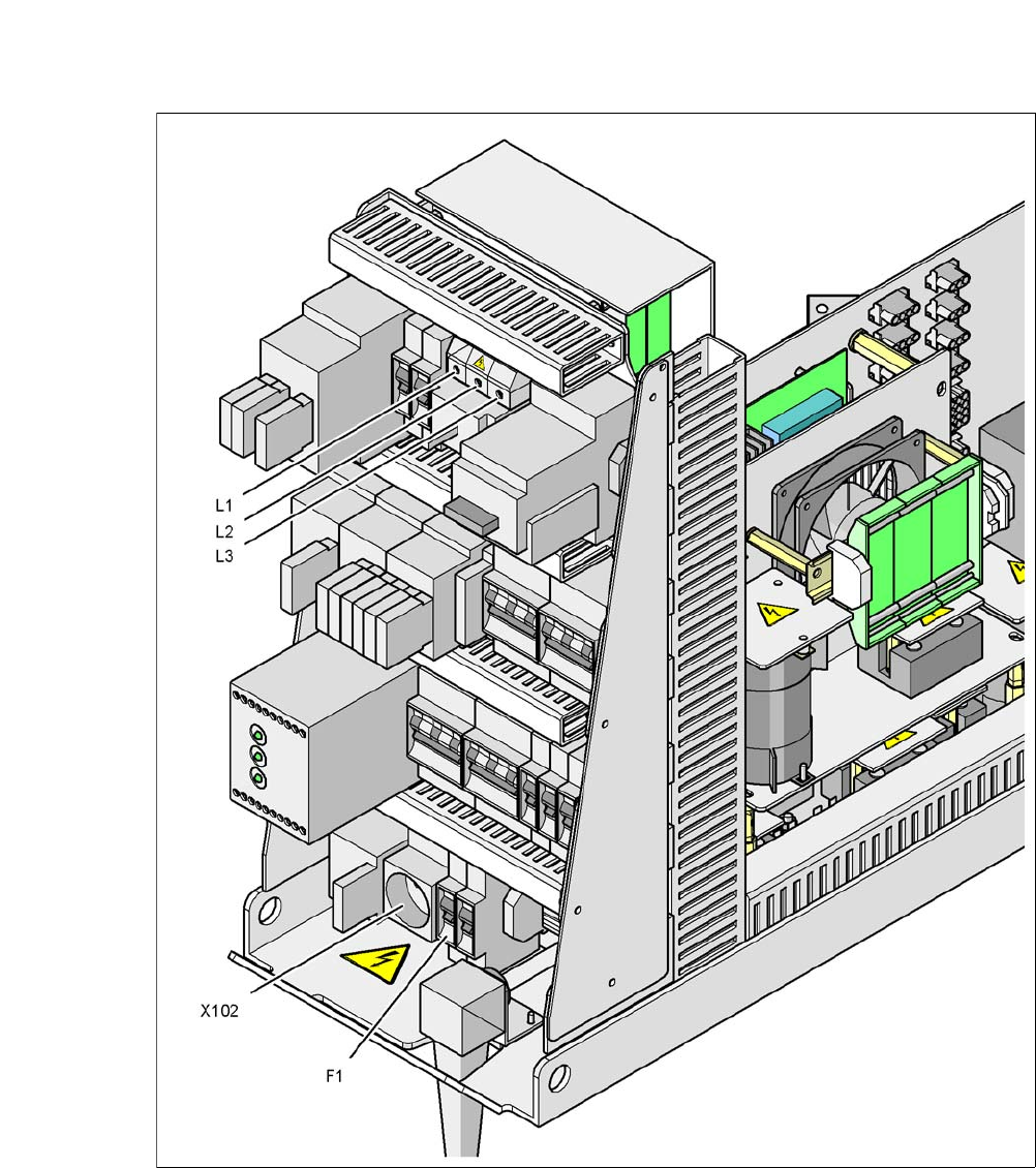 – Klemmenfeld X100 zum Anschluss des Netzversorgungskabels (siehe Abb. 2.11 - 5