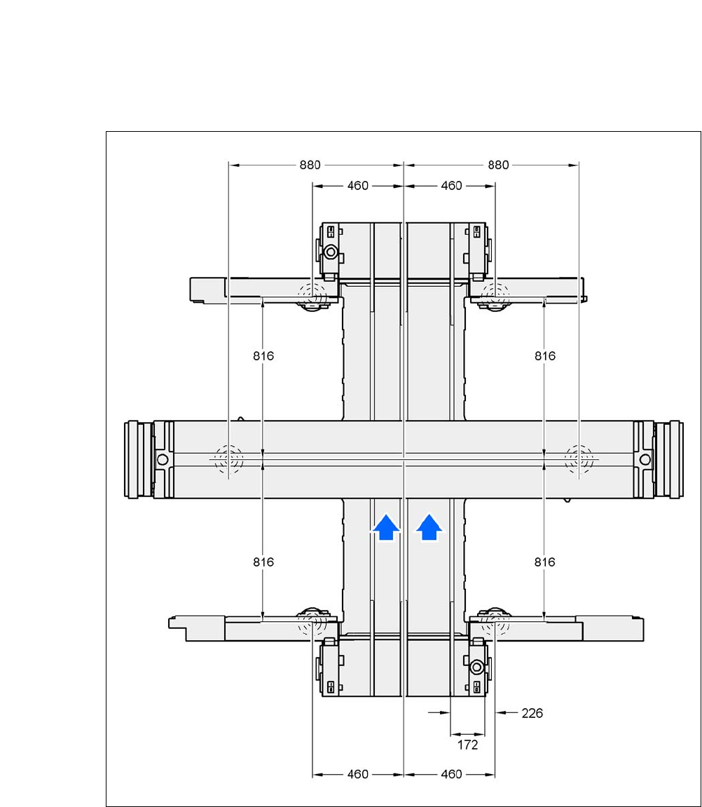 Abb. 3.4 - 6 Abstandsmaße der Maschinenfüße und der festen rechten Transportkante des LP-Doppeltransports