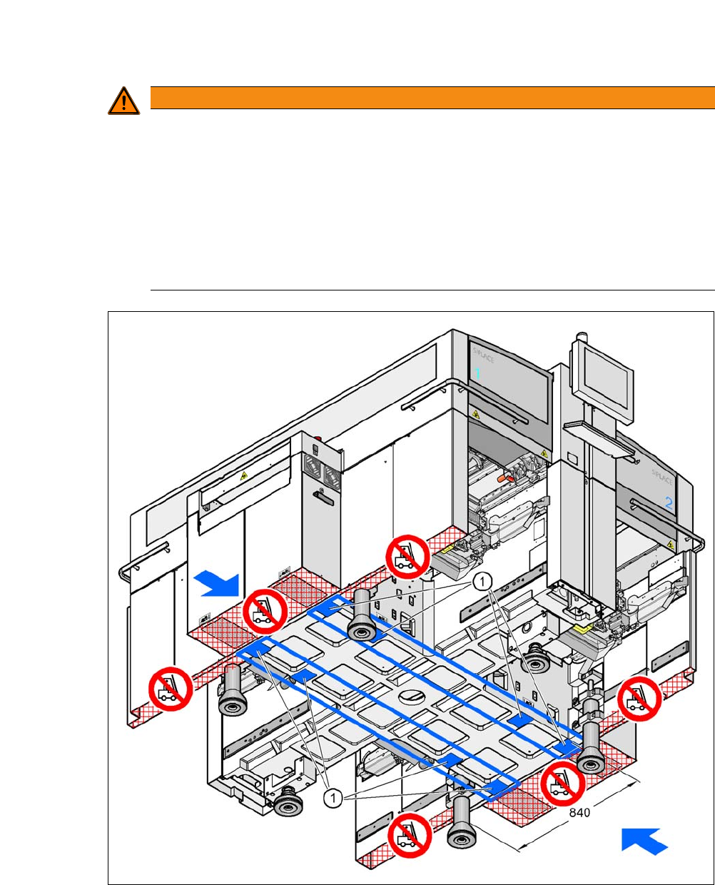 5 Aufstellen und Inbetriebnahme Betriebsanleitung SIPLACE CA-Serie 5.2 Anlieferungskonfiguration und Trans po rt des Bestückautomaten Ab Softwareversion SR 708.0 Ausgabe 12/2014 DE -DRAFT 264 Gabel quer zum Leiterplatten…