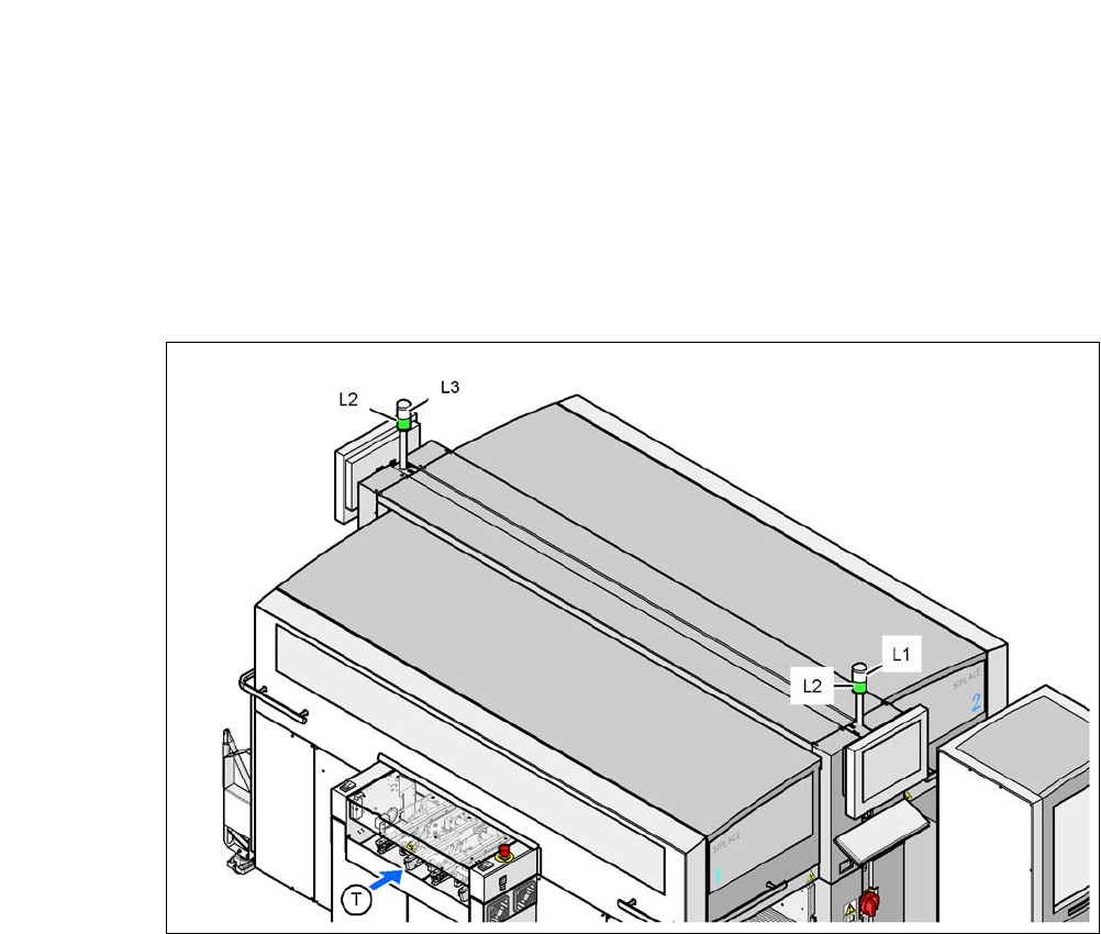 6 Aufgaben an der Maschine Betriebsanleitung SIPLACE CA-Serie 6.15 Meldeleuchte für Betriebszustände beachten Ab Softwarever sion SR 708.0 Ausgabe 12/2014 DE -DR AFT 394 – Linke Störlampe L3 (we iß) blinkt Auf der linken…