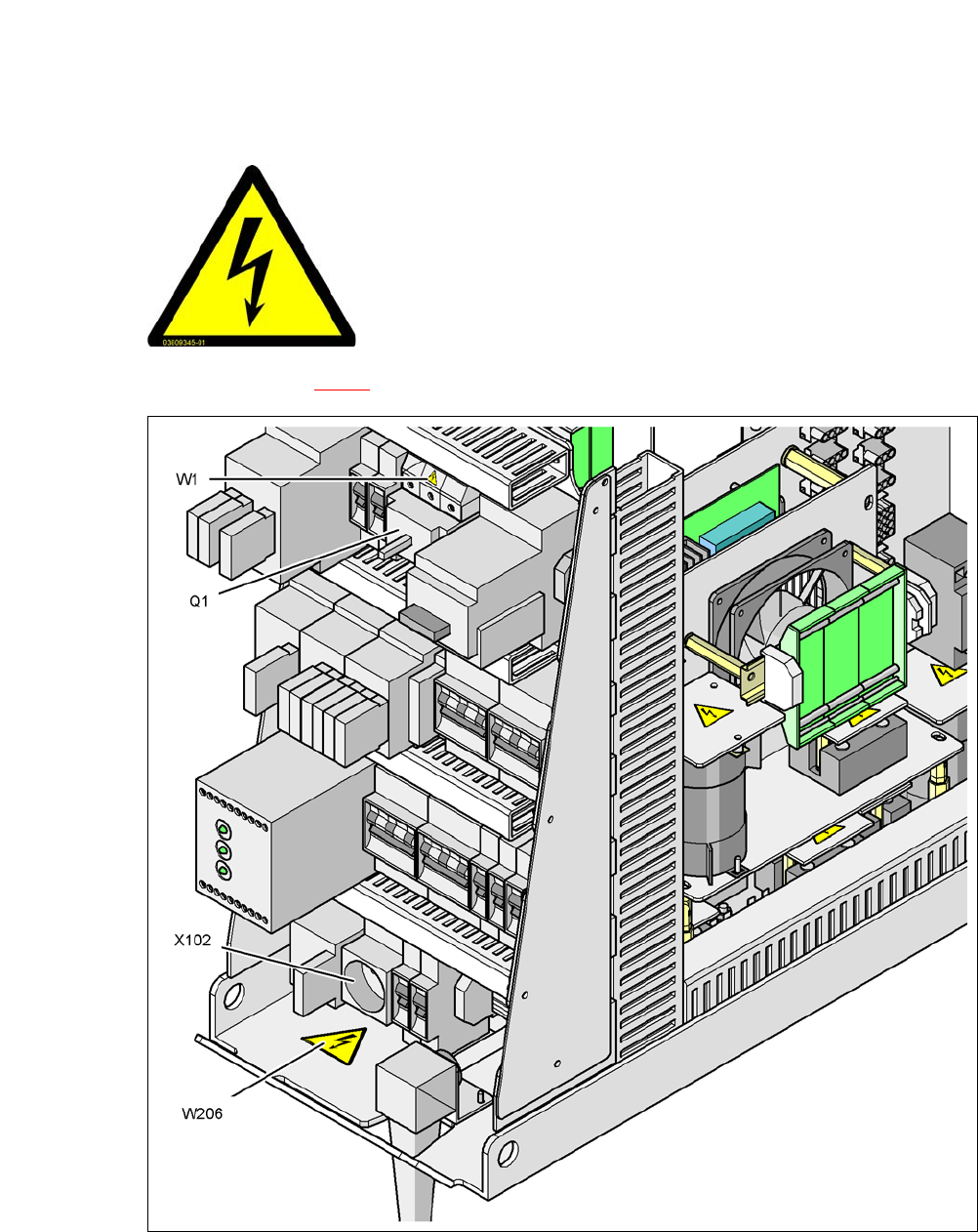 Abb. 2.2 - 6 Warnschild W206 an der Servicesteckdose X102 und W1 am Hauptschalter Q1
