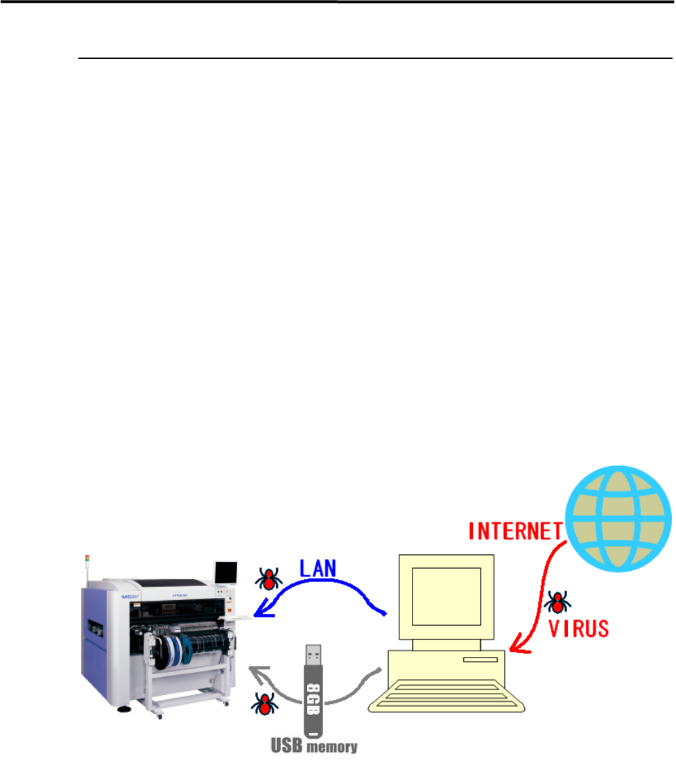 Virus checker software cannot be installed in the machines. Followings are suggested for the prevention.