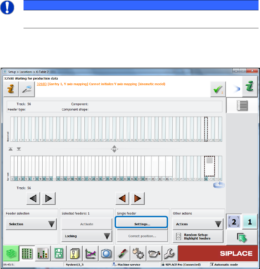 SIPLACE BulkFeede r X / Operating Ma nual 05/2017 Edition 19 4.2 Setti ngs in SIPLACE Pro The SIPLACE B ulkFeeder X can be con figured togeth er with SIPLACE Pro. NOTICE Detailed inform ation on how to work with SIPLACE …