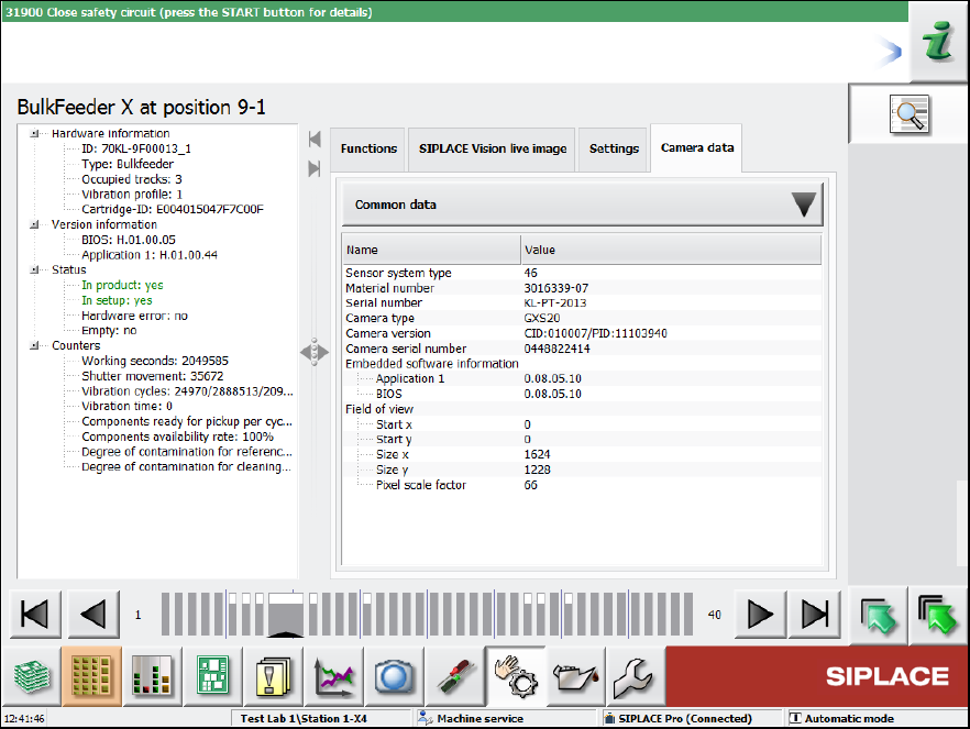 SIPLACE BulkFeede r X / Operating Ma nual 05/2017 Edition 45 Figure 5-10: Feeder details – Ca mera data In the Camera data t ab, details on the i nternal camer a are displayed.
