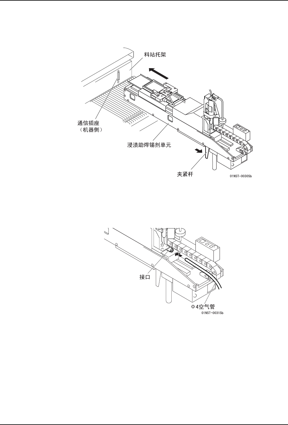 4. 基本操作 QD114-07 16 桥式浸渍助焊剂单元使用说明书 4. 将浸渍助焊剂单元底部的导轨对准料站托 架上的料站并插入。 5. 拉住夹紧杆,将浸渍助焊剂单元向前方滑动 ,推入到使前端的插头完全插入料站托架侧 的插座内为止。 6. 松开夹紧杆,将浸渍助焊剂单元固定在料 站托架上。 7. 将 " 3. 安装 " 中配套的 Φ4 空气管连接到浸渍助焊剂单元的接口上。 打开空气 开关阀, 供应空气。 备注 )关于…