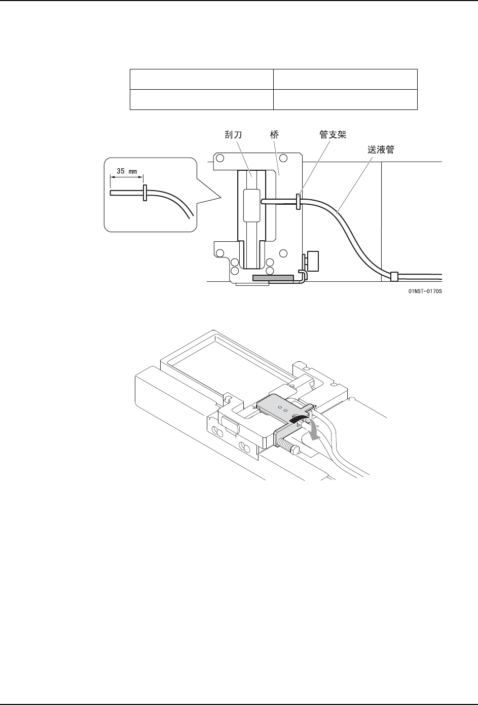 3. 在离开送液管口的 35 mm 位置处安装管支架。将管口插入刮刀孔内,将管支架安装在桥