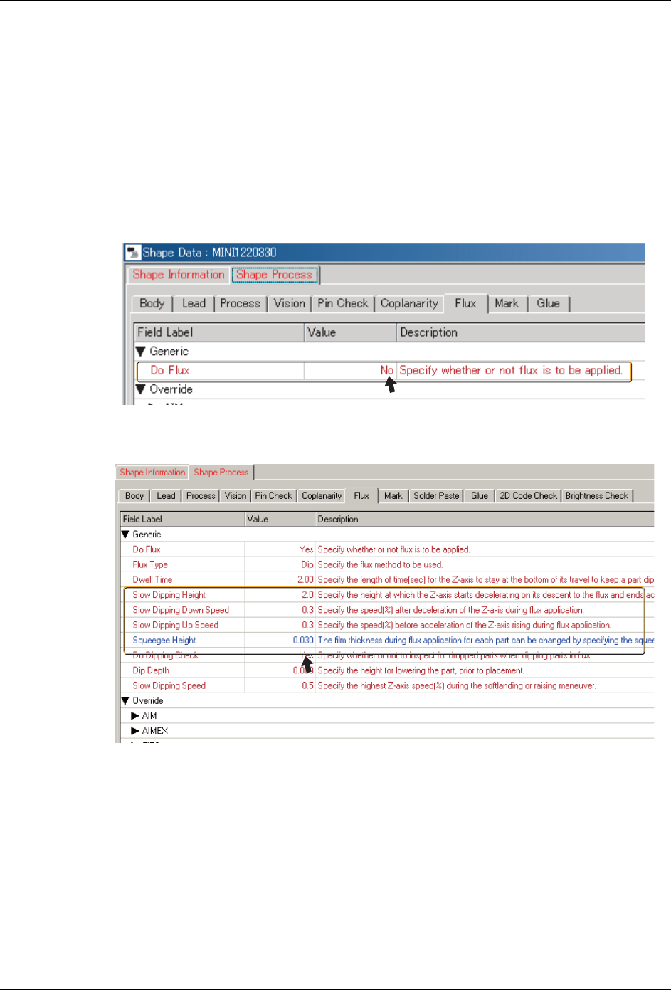 1. 对于进行浸渍动作的元件,请选择 [Shape Process]-[Flux] 标签页,进行以下的设定。