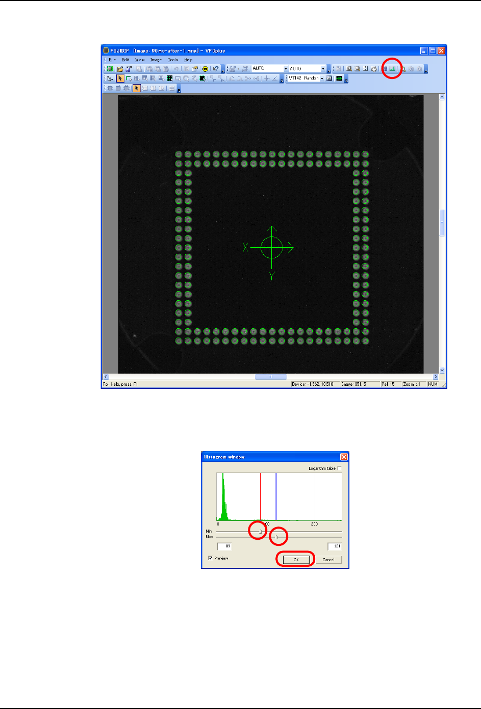 QD114-07 8. 下锡检查功能 桥式浸渍助焊剂单元使用说明书 51 8. 请 选择 [Image] - [Display Histogram Wi ndow]。[Histogram Wi ndow] 被打开 。 9. 左右移动 [Histogram Window] 的滑块,调整阈值,使得锡 球部分能够清晰地显示。 备注 )此时,设定成阈值的幅度 (Max - Min)尽可能在窄的范围内。 01NST -0942E 01NST -0…