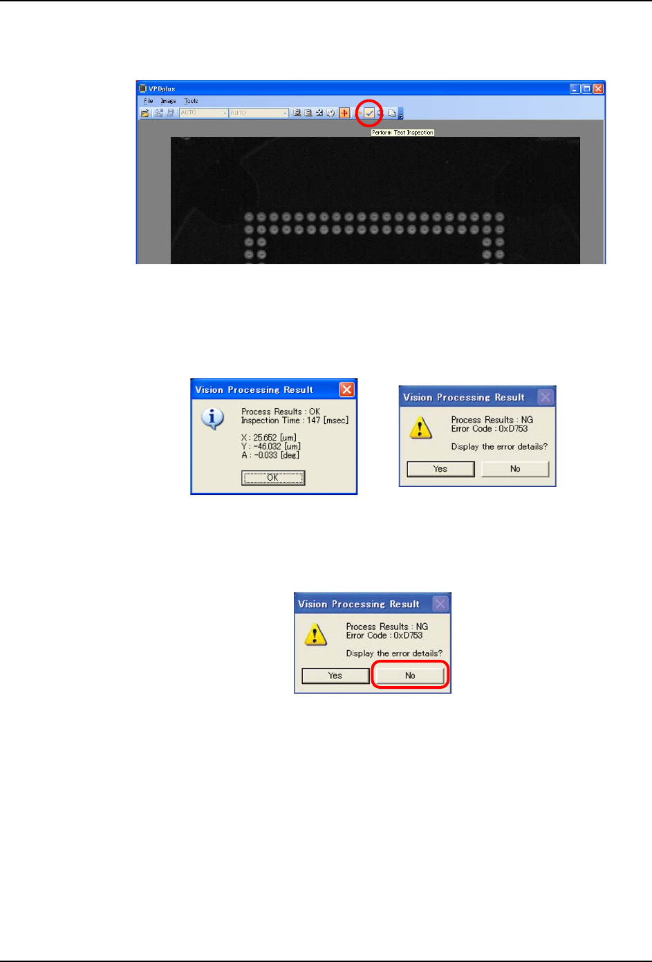 QD114-07 8. 下锡检查功能 桥式浸渍助焊剂单元使用说明书 53 14.请选择 [Too ls] - [Perform Test]。 测试被执行, 显示 [Vision Processi ng Result] 对 话框。 15.请确认影像处理结果, 关闭测试处理画面。 如果 [OK], 请转到步骤 25.,进行下锡前 的影像的测试。如果 [Error],请 尝试以下的 方法。 16.如果影像处理结果为错误,请点击 〈No 〉 。…