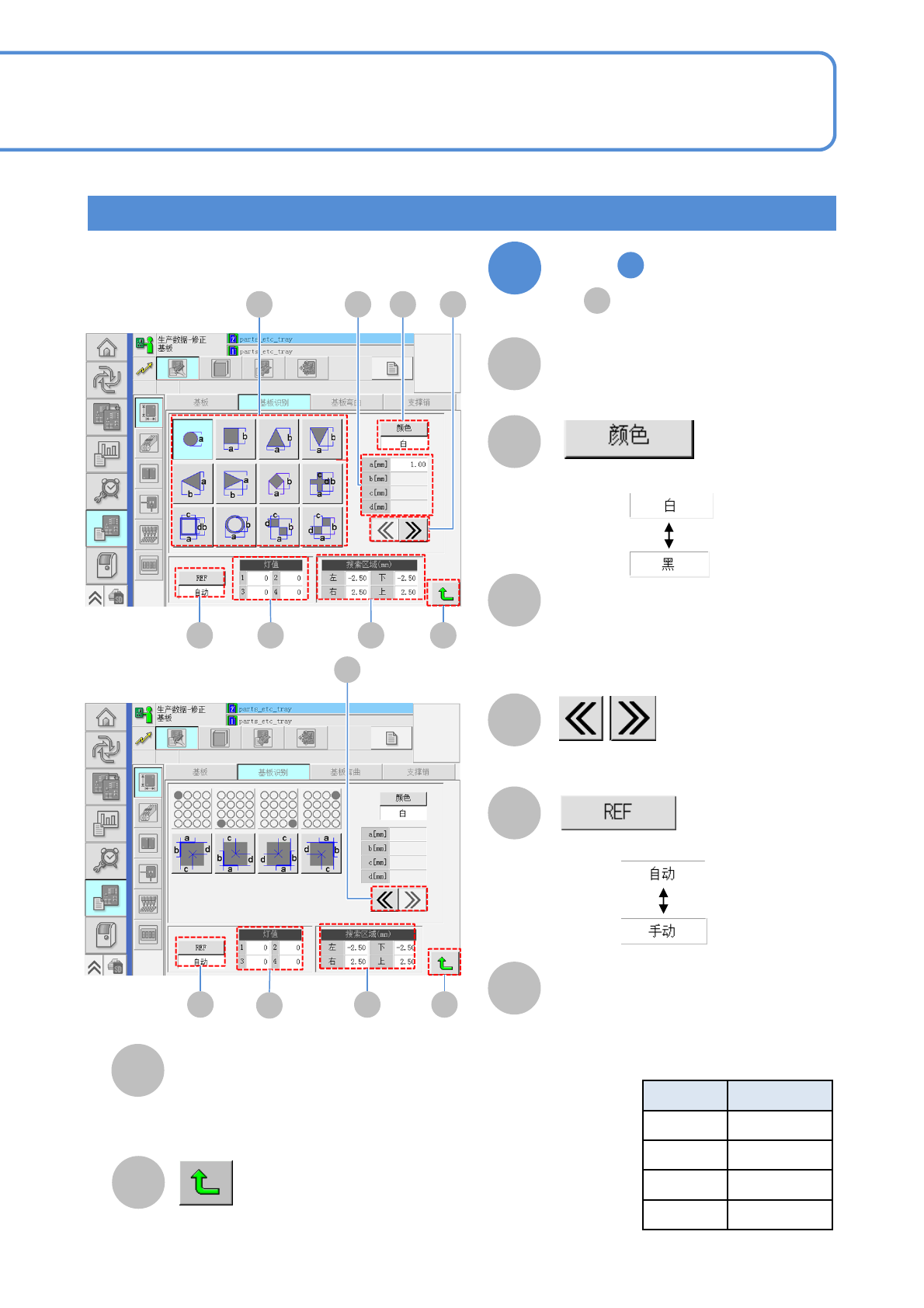 EJM9DC-MB-12E-0 2 NPM-W X/WXS 12-1-3 -2 B A C D E F H G E F G D A C B 形状选择和修改 H E F G D H 2 指示灯值 照明种类 1 同轴照明 2 高角度照明 3 中角度照明 4 低角度照明 1 E 尺寸 选择识别标记的颜色。 形状选择 选择的识别标记的形状的尺寸。 选择识别标记的形状。 在步骤 ( → P .12-1-3-1) 的画面上 按 ( 类型 ) ●触摸…