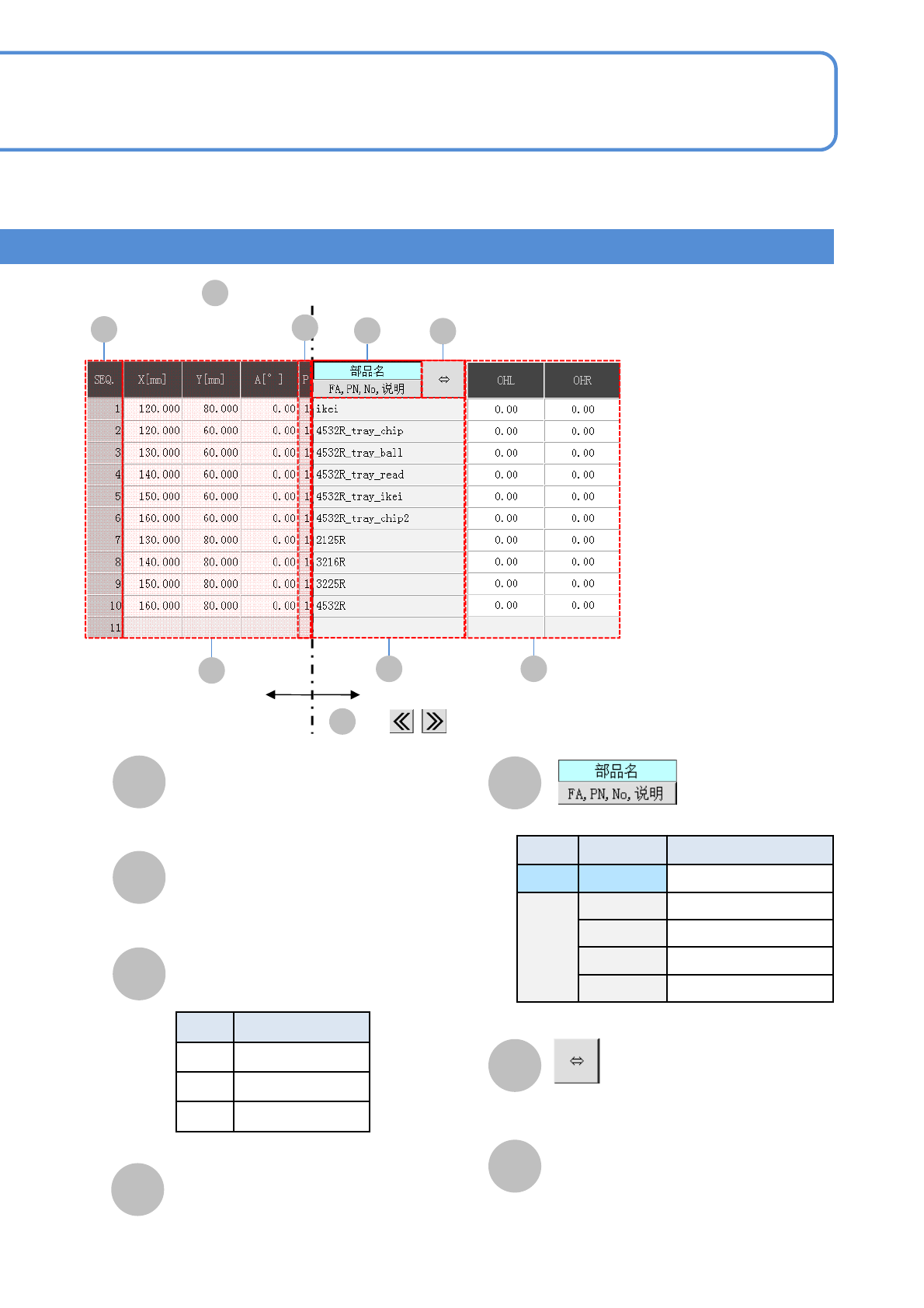 EJM9DC-MB-12E-0 2 NPM-W X/WXS N M K 12-1-12 -2 I J OHL/OHR K J I O L M N O C SEQ. X[mm],Y[mm], A[ ] P L ■生产数据信息 的 一览表 E 固定显示信息 按 键,显示变动信息 记号 优先顺序 空白 标准 H 优先度高。 L 优先度低。 贴装点的序列 No. 。 贴装点的坐标和角度。 贴装点的优先顺序。 元件 /F A,PN,No, 说…