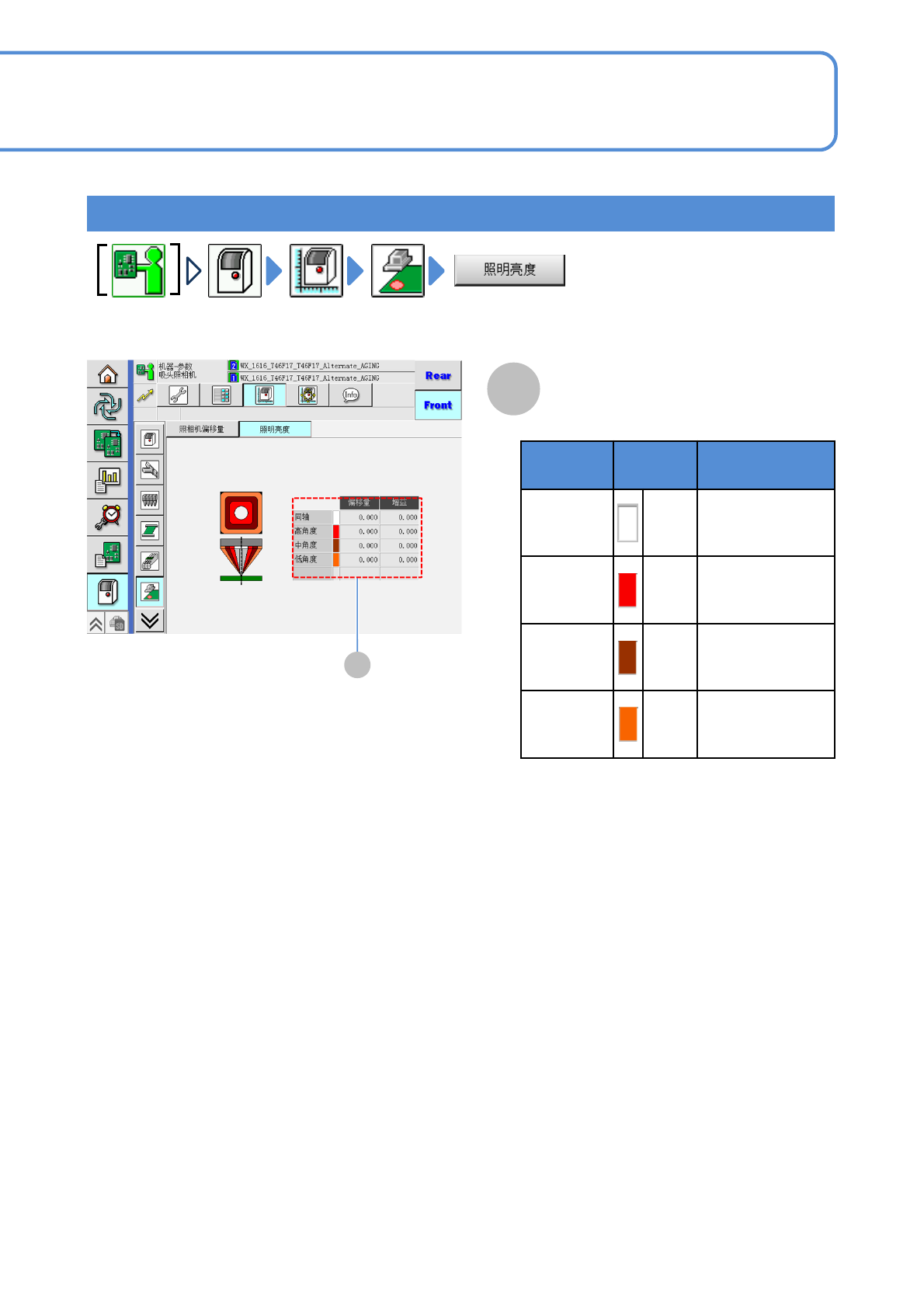EJM9DC-MB-13E-0 2 NPM-W X/WXS 13-3-12 -2 确认照明亮度 A 照明 种类 颜色 说明 同轴 照明 白色 同轴照明 ・ 亮度偏移值 ・ 亮度增益值 高角度 照明 红色 高角度照明 ・ 亮度偏移值 ・ 亮度增益值 中角度 照明 褐色 中角度照明 ・ 亮度偏移值 ・ 亮度增益值 低角度 照明 橙色 低角度照明 ・ 亮度偏移值 ・ 亮度增益值 照明的亮度偏移值和亮度增益值 贴装头照相机照明 ( 标准 ) A