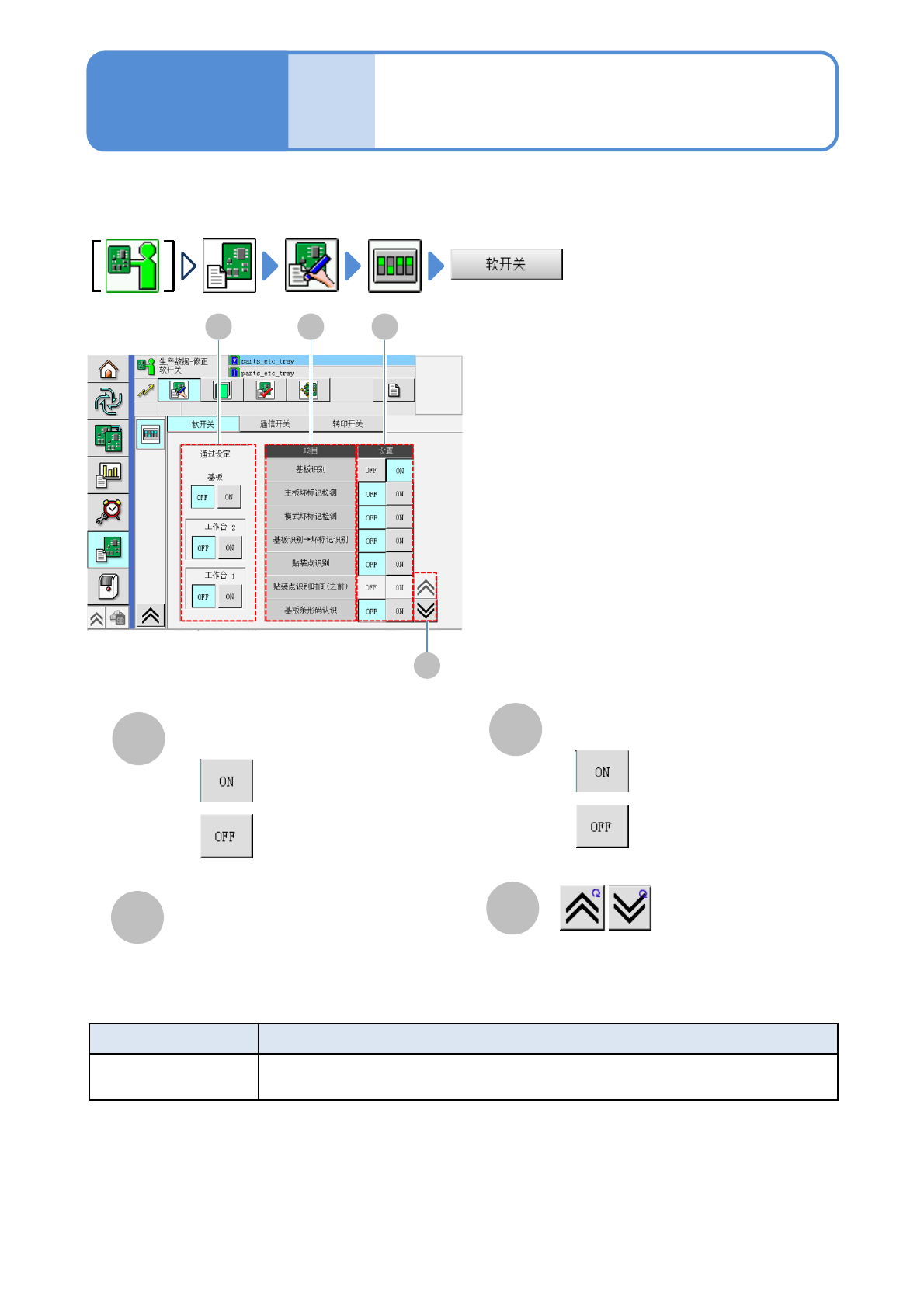 运转条件的设定和工作台的ON、OFF切换。