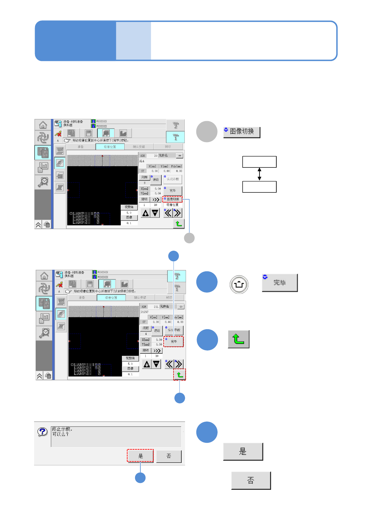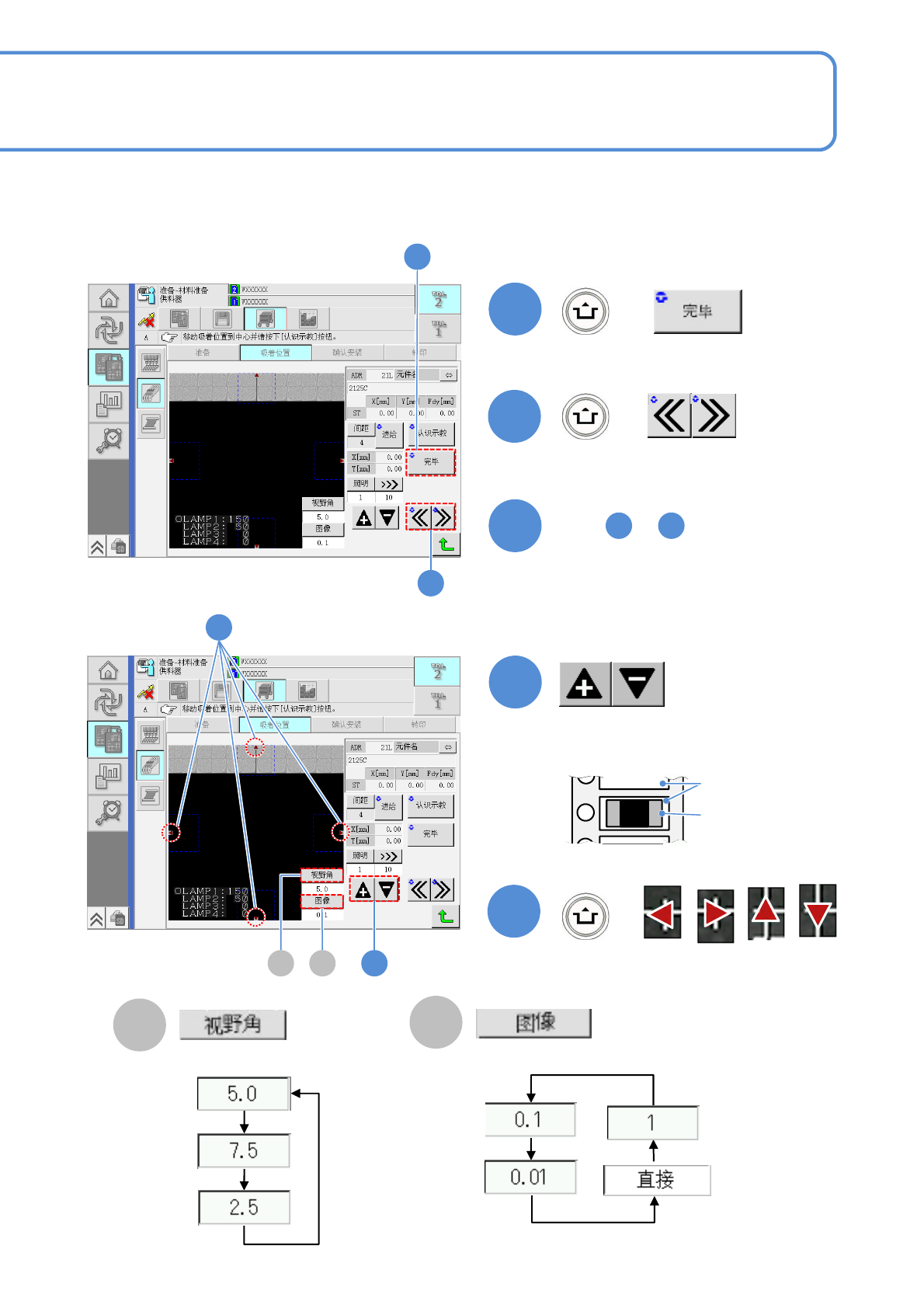 EJM9DC-MB-12E-0 2 NPM-W X/WXS 5 + 6 4 + 12-2-8 -2 7 + 8 B C 5 4 7 8 B C ( 数据被保存 ) 选择下一台供料器。 重复 的操作 5 3 ~ ■手动示教时 调节亮度,使凹槽的图像清晰可见。 凹槽的中心 ( 吸着位置 ) 和 十字线中心保 持一致。 凹槽 元件 调整视野范围。 切换图像的移动量。