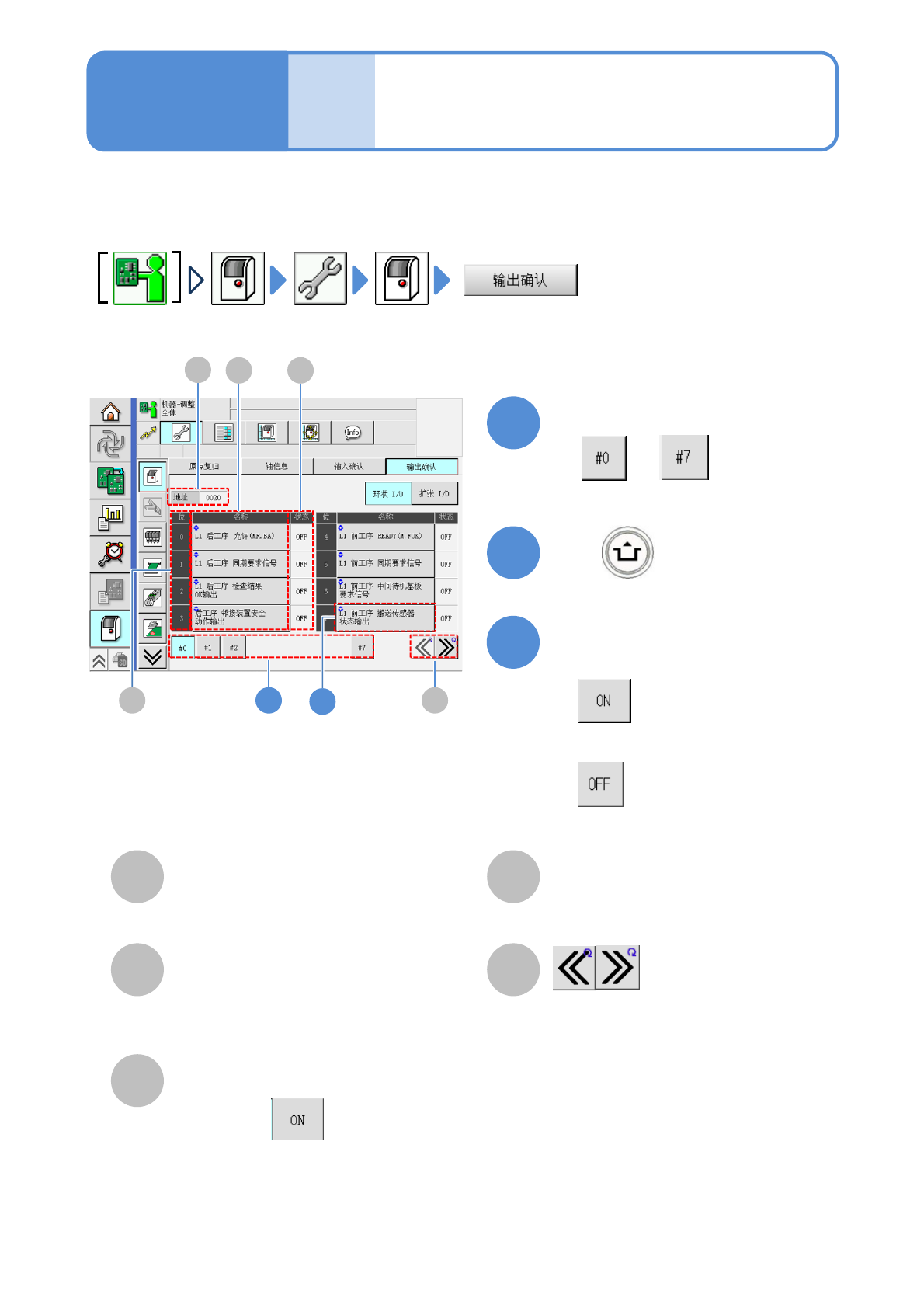 设备中使用的所有输出地址的状态以各BIT名称表示,确认其名称,根据需要来切换ON或OFF。