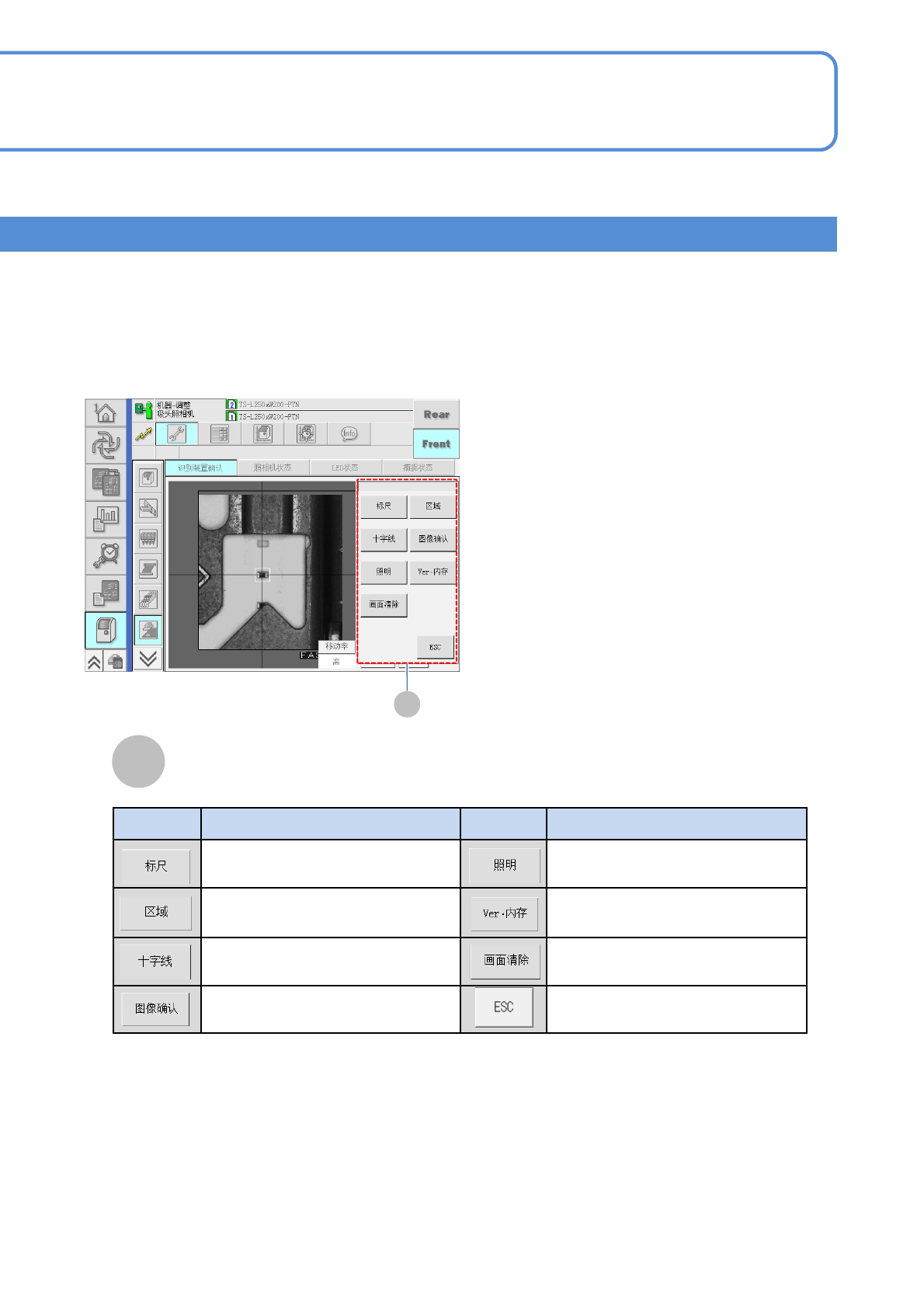 EJM9DC-MB-13E-0 2 NPM-W X/WXS 操作键 功能 操作键 功能 在画面上显示同心圆的标尺。 可以调整亮度。※ 在画面上显示四角框。※ 显示识别系统的版本。 在画面上显示十字线。 清除正显示的图像。 显示亮度选择画面。 返回原来画面。 13-2-9 -2 E E ※ NPM-WXS 仅可选择 Front 侧的 [ 照明 ] 和 [ 区域 ] 。 画面显示功能 ■「功能」画面
