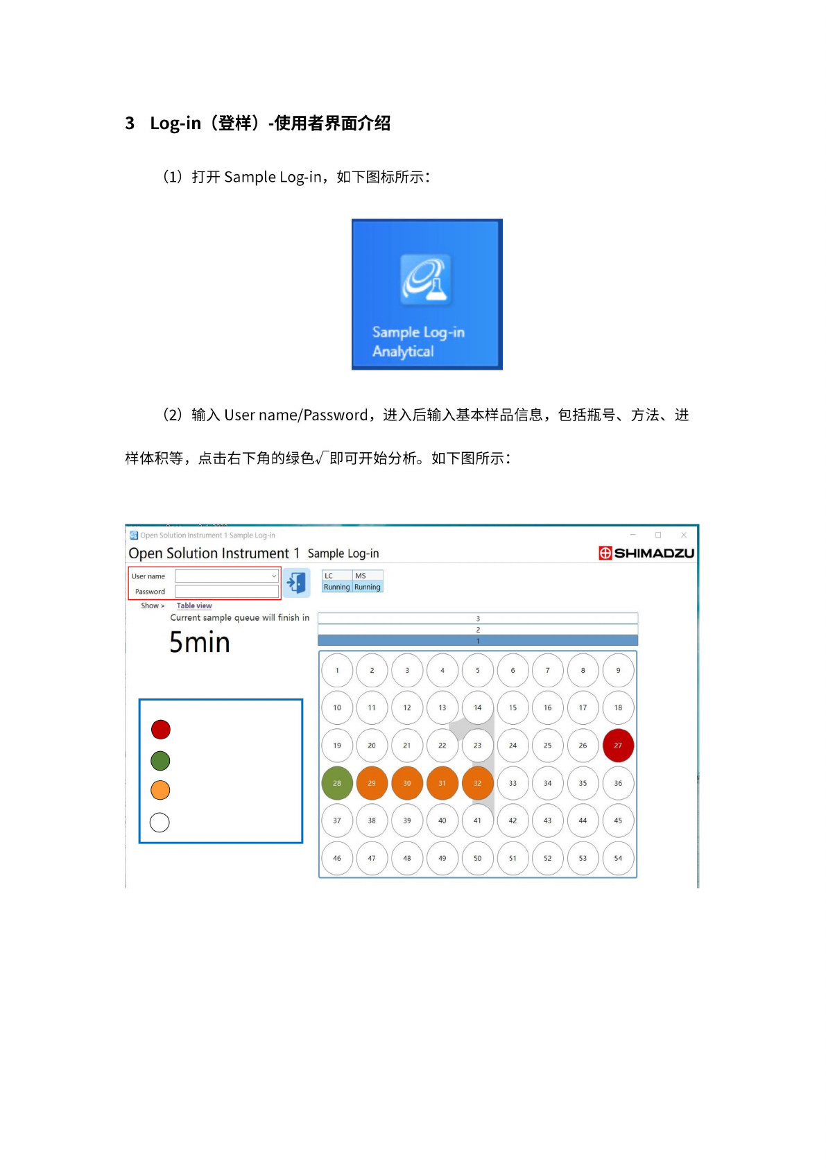 17 3 Log-in (登 样) -使 用者界 面介绍 打开 Sample Log-in, 如 下图标 所示: (2) 输入 Username/Password, 进入后 输入基 本样品 信息, 包括 瓶号、 方法、 进 样体 积等, 点 击右下 角的绿 色g即 可开始 分析。 如下图 所示: 困 Open Solution Instrument 1 Sample…