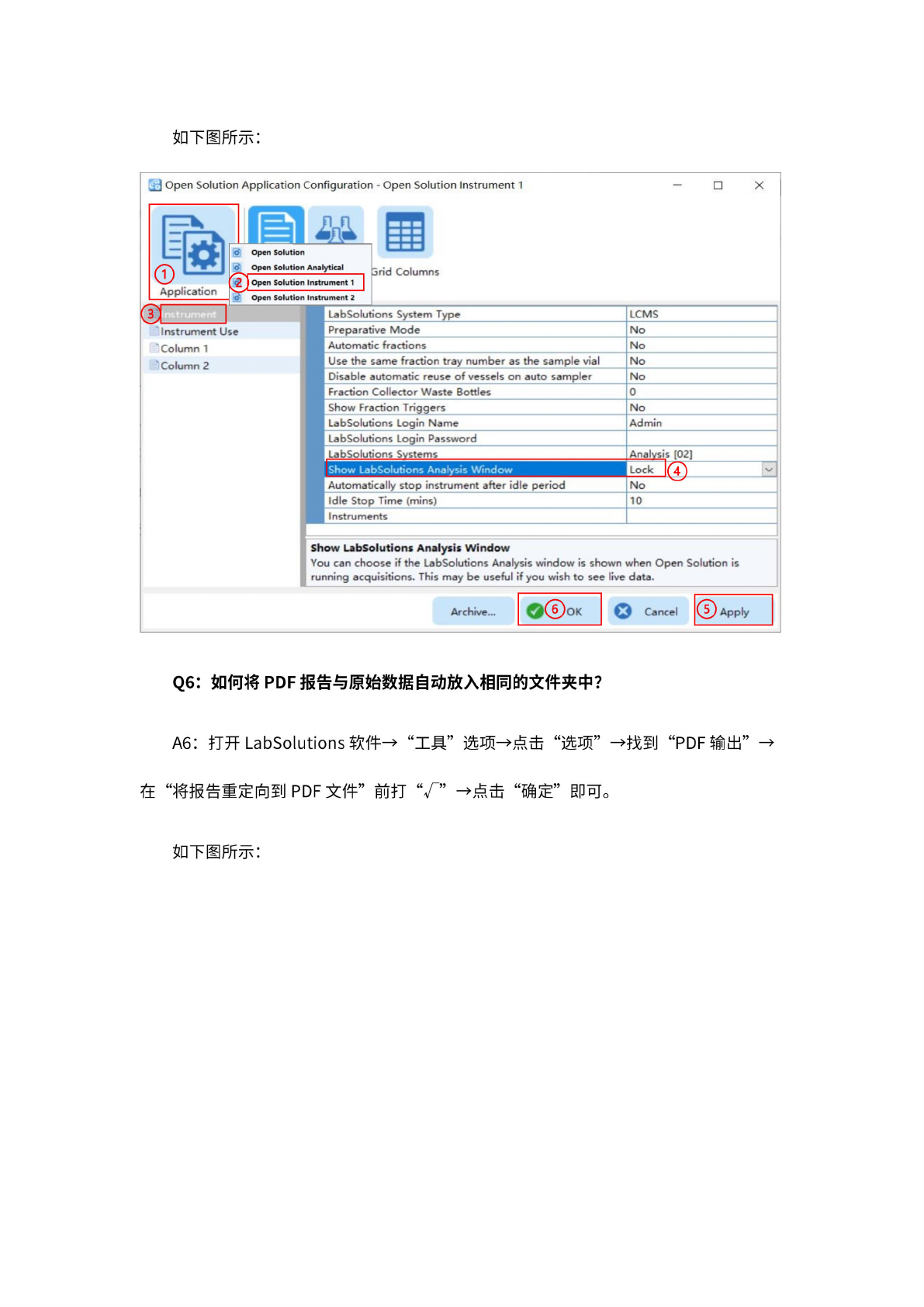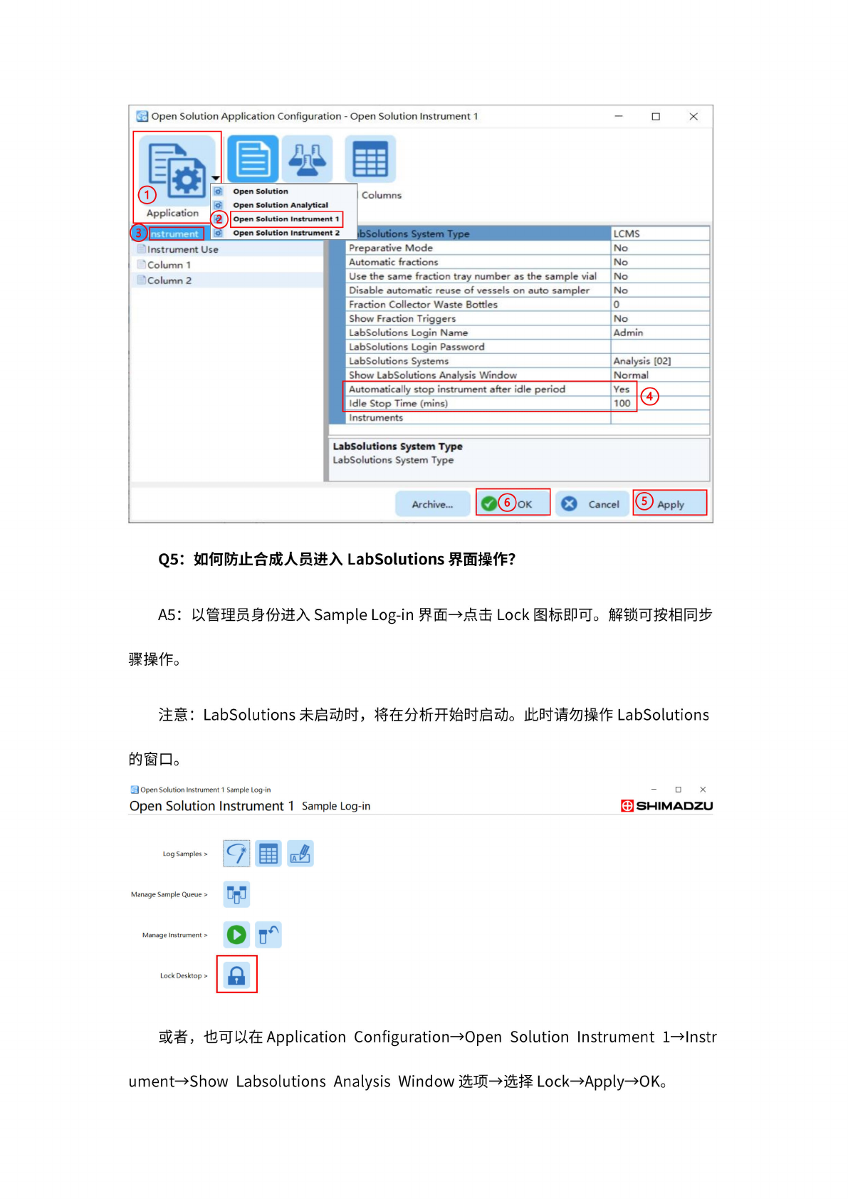 22 Q5: 如 何防止 合成人 员进入 LabSolutions 界面 操作? A5: 以管 理员身 份进入 Sample Log-in 界面 一点击 Lock 图标 即可。 解 锁可按 相同步 骤 操作。 注意: LabSolutions 未启 动时, 将 在分析 开始时 启动。 此时请 勿操作 LabSolutions 的 窗口。 困 Open Solution Instrument 1 Sample Log-in Open So…