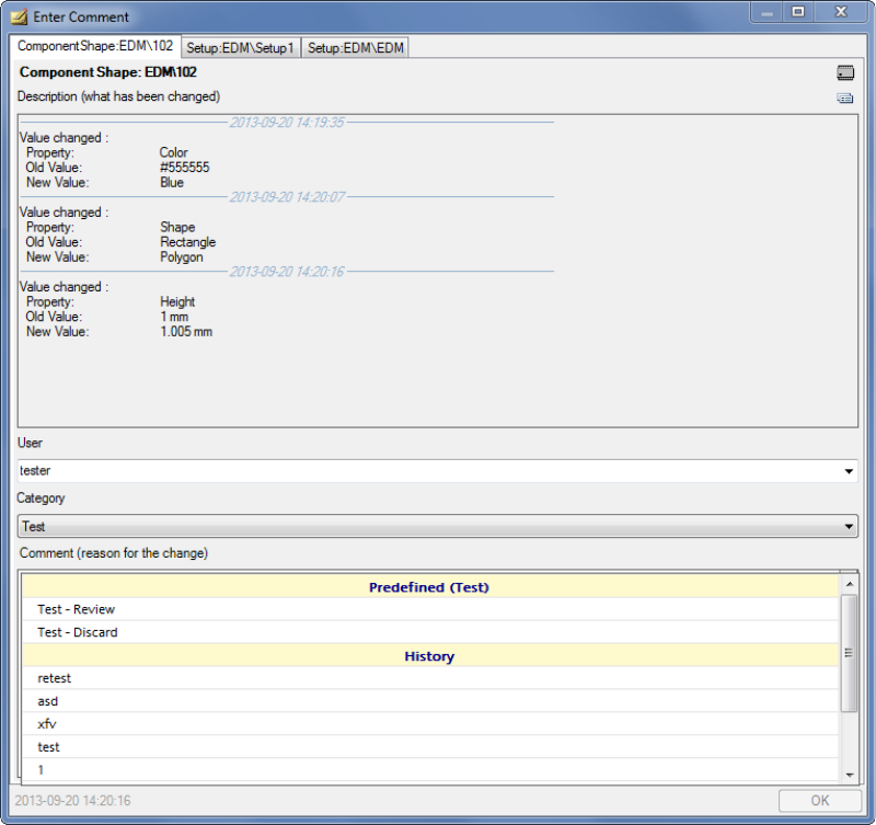 The standard EDM Comment dialog has been extended to display multiple tab pages if another