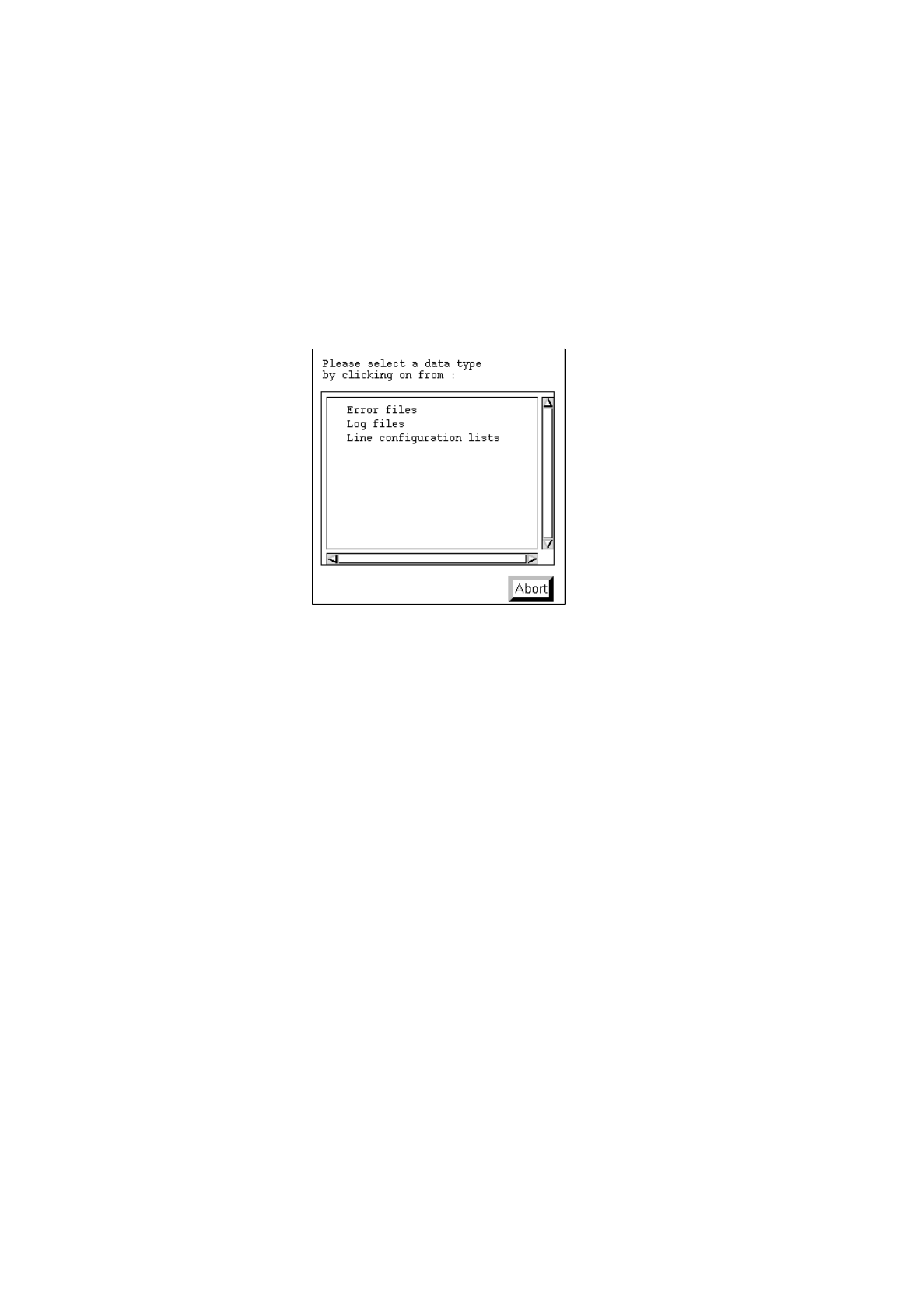 Click on desired data type, e.g. Error files (or Abort if the dialog box is to be closed without
