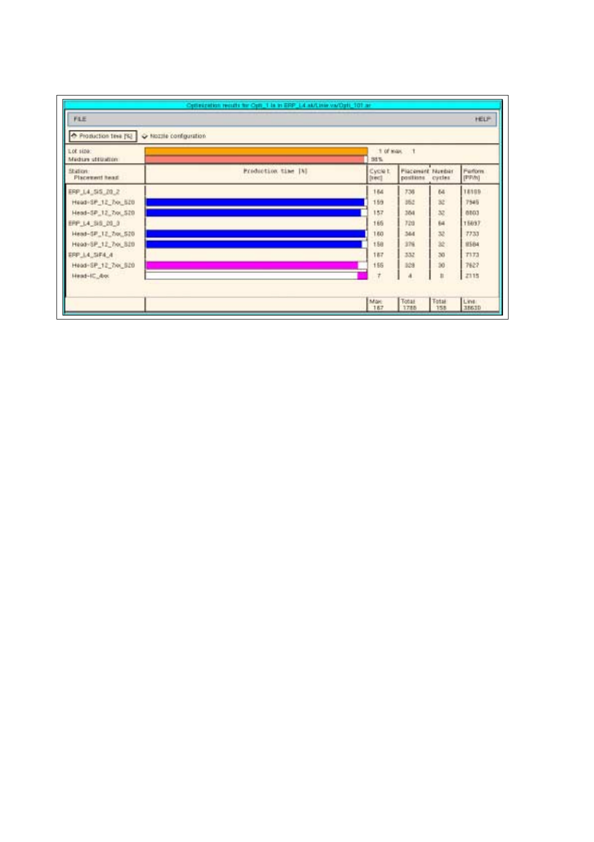 For each station, each placement head and the entire line, the results of the optimization process are
