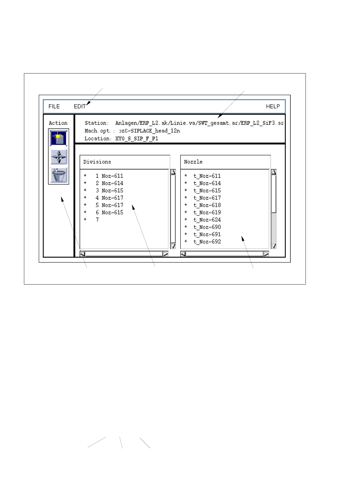 12 Production Tools / Station and Line Confi guration User’s Manual Line Computer UNIX 12.1 Configuration Edit or Software Version 403.xx Edition 06/97 12 - 18 12.1.3.5 Main Windo w of Machine O ptions Editor "Nozzl…