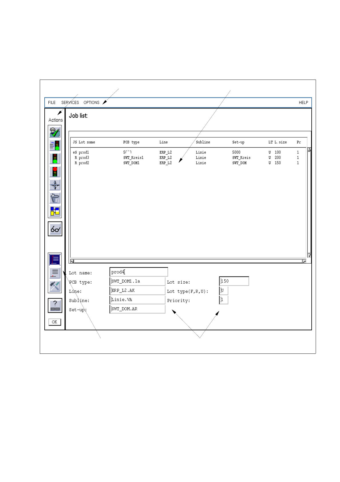 User’s Manual Line Computer UNIX 14 Control / Control Modules Software Version 403.xx Edition 06/97 14.2 Job Control 14 - 5 14.2.3 Main Displa y Windo w of Job Contr ol The dif ferent ar eas of the main wind ow of the Jo…