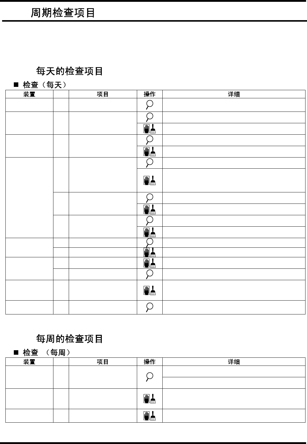 BM221 维修手 册 8.2 周期检 查项 目 E33MC C-Z0-021 -D0 8.2-1 8.2. E33MCC-Z0-021- D0 本节将 本章 的检查项 目按 照检查周 期进 行了概括 。 检查位 置和 注油的详 细内 容,请参 照本 章。 装置栏 的数 字表示参 照处 的项目号 码。 8.2.1 No. 8.3.1 主调节 器 a. 压力表 空气 压力 : 0 .40 ~ 0 .43 M Pa 无异 物。 8.4.1 …