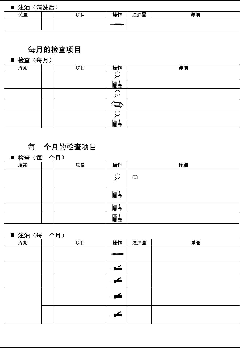 BM221 维修手 册 8.2 周期检 查项 目 E33MC C-Z0-021 -D0 8.2-3 No. 8.7.1 头驱动 部 1. H 轴滚珠 丝杠 0.5 cm 3 (1 sho t) 吸嘴 : N2+U 型 位置 : 润滑脂 注入 口( 8 处) 8.8.1 吸嘴架 部 1. 吸嘴架 0.1 cm 3 Touch lube 位置 : 钢球( 3x8 吸嘴) 1. 滚珠丝 杠 0.2 cm 3 位置 : 表面( 2 个) 8.9…
