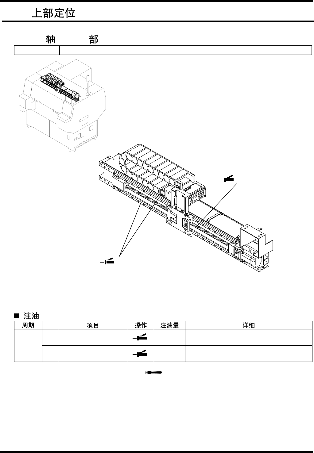 BM221 维修手 册 8.6 上部定 位 E33MC C-Z1-001 -C0 8.6-1 8.6. E33MCC-Z1-001- C0 8.6.1 X Robot Unit No. 108 62041 00 向滚珠 丝杠 、 LM 导轨注 油时 ,可以通 过刷 子( )来 涂敷 。 No. 1. 滚珠丝 杠 2.0 cm 3 (4 sh ots) 吸嘴 : P +U 型 位置 : 润滑脂 注入 口( 1 处) 3 个月 2. LM …