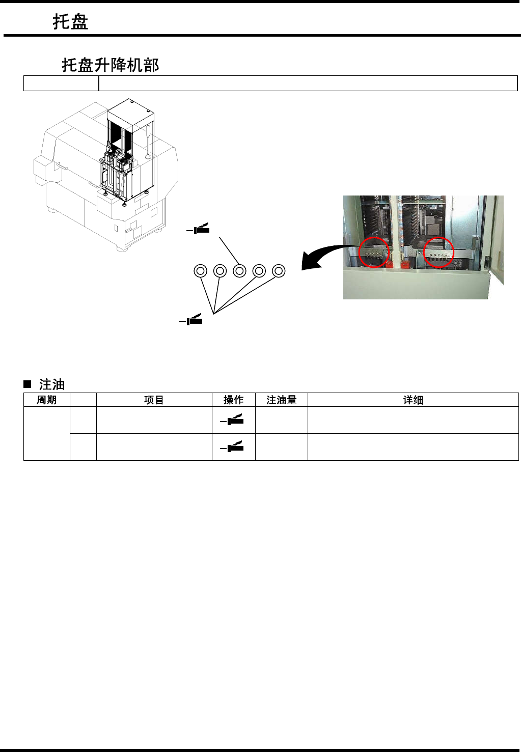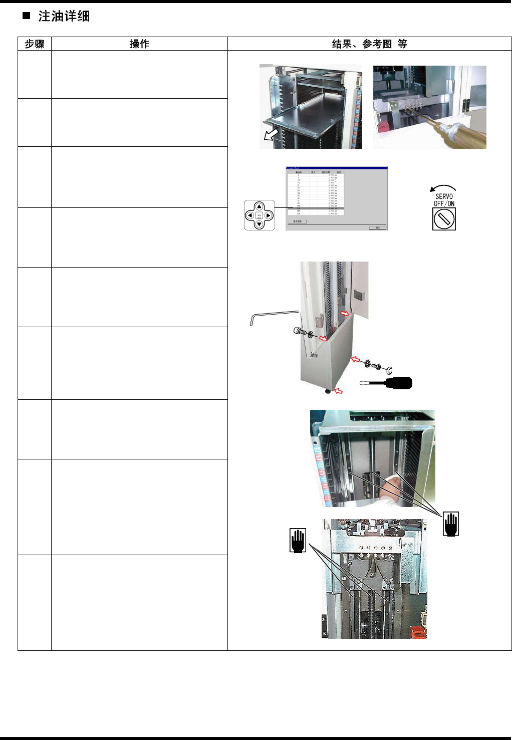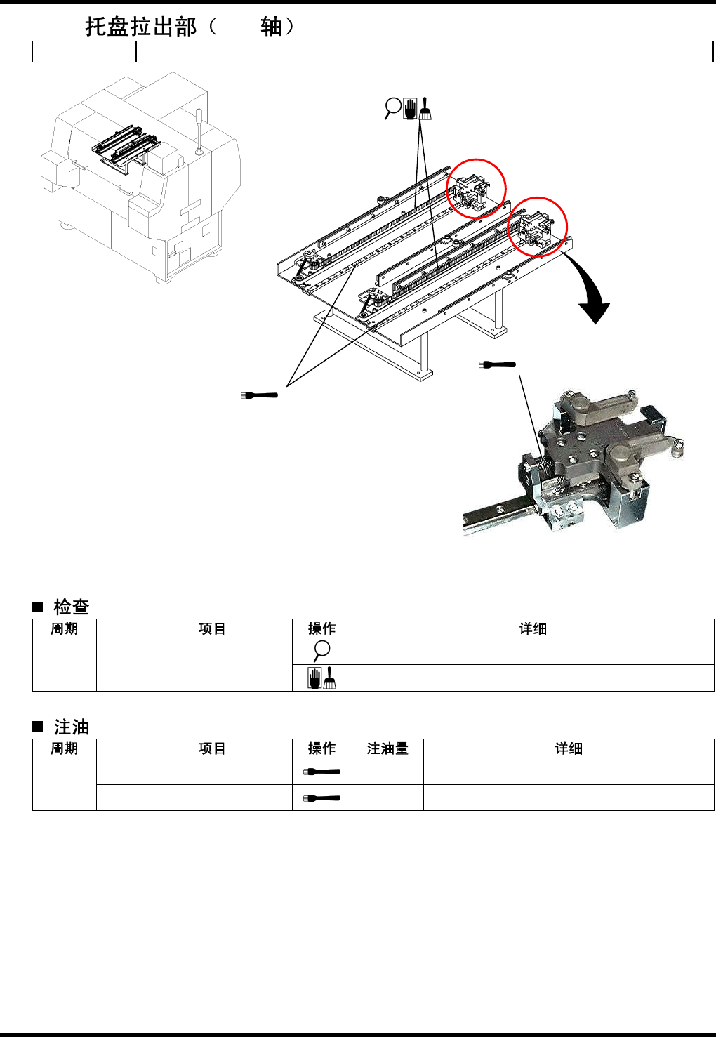 BM221 维修手 册 8.11 托盘 E3 3MCC-Z5 -301-B 0 8.1 1-2 2. x2 x2 1. 取下机 架内 的板。 2. 用润滑 脂枪 注油。 3. 通过 JOG 功能从 上端 向下端移 动工 作 台数次 。 4. 把工作 台置 于上段, 关闭 伺服系统 。 5. 卸下托 盘升 降机盖。 6. 用纱布 擦掉 附着在工 作台 下的滚珠 丝 杠、 LM 导轨上 的多 余润滑脂 。 7. 安装托 盘升 降机盖。 8.…