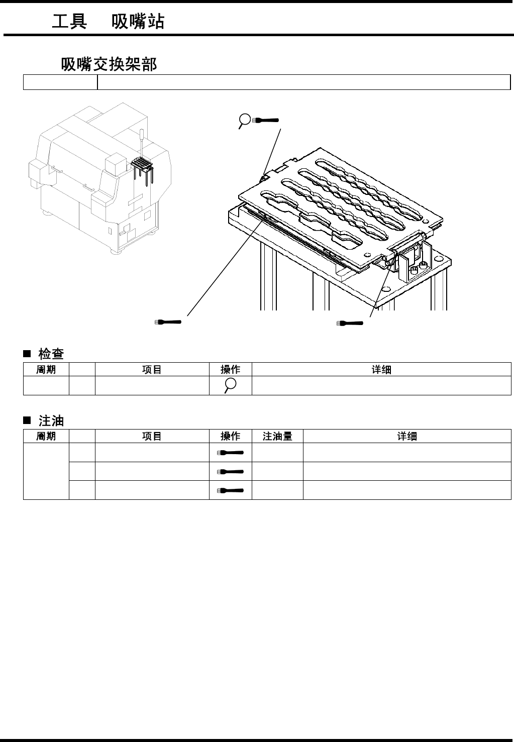BM221 维修手 册 8.12 工具 / 吸嘴站 E33M CC-Z5 -501-B 0 8.12-1 8.12. / E33MCC-Z5-501- B0 8.12.1 Unit No. 108 62192 00 No. 每日 a. 联杆支 点 顺利滑 动。 No. 1. 联杆支 点 0.1 cm 3 位置 : 联杆支 点( 8 处) 2. 滚子 / 托架 0.1 cm 3 位置 : 接触面 ( 2 处) 3 个月 3. 销 / 板 …