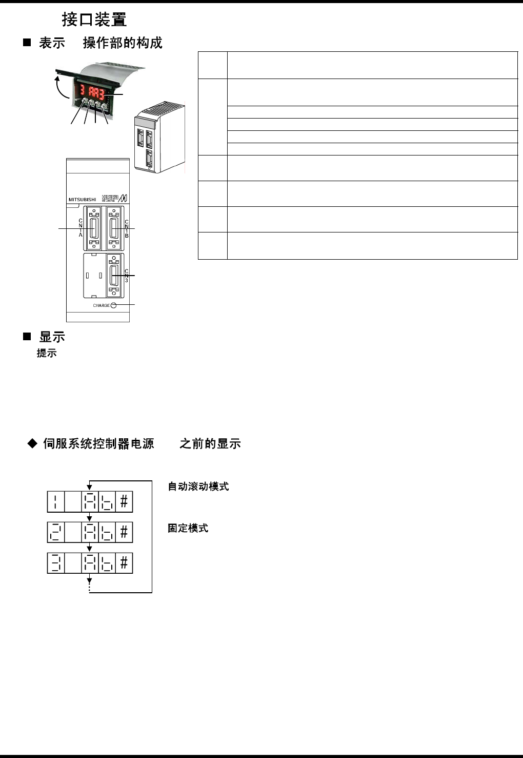 BM221 维修手 册 4.3 伺服放 大器 ( MR J2M ) E3 3MCC-14 -151-B 0 4.3-2 4.3.2 / 1. 显示部 显示运 转状 态、报 警。 按钮开 关 用于变 更状 态显示 及接口 装置的 参数 设定。 a) MOD E b) UP c) DOWN 2 d) S ET 3. CN1 A 总线电 缆连 接用连 接器 4. CN1 B 总线电 缆连 接用连 接器 5. CN3 通信用 连接 器 6. 充…