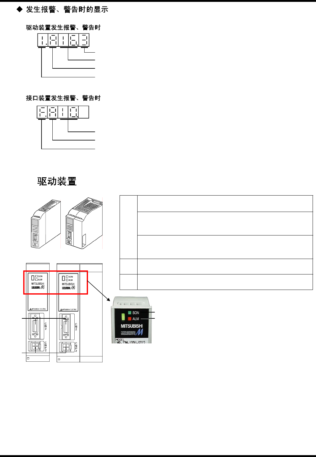 BM221 维修手 册 4.3 伺服放 大器 ( MR J2M ) E3 3MCC-14 -151-B 0 4.3-4 发生报 警过 程当中, 第 5 位和第 2 位的小 数点 闪烁。 4.3.3 状态显 示 LE D 表示驱 动装 置的状 态。 a) SON 绿灯 闪烁 : 伺服 OFF 状态 绿灯 亮 : 伺服 ON 状态 1. b) A LM 红灯 闪烁 : 警告状 态 红灯 亮 : 报警状 态 2. CN2 检测器 用连 接器 …
