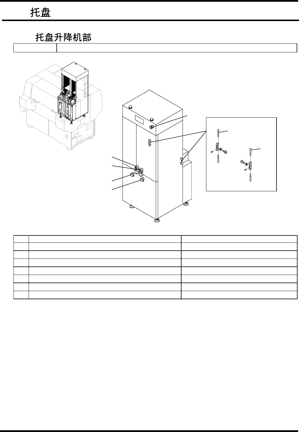 BM221 维修手 册 5.5 托盘 E33M CC-Y 5-301 -D0 5.5-1 5.5. E33MCC-Y5-301-D0 5.5.1 Unit No. 108 62513 00/ 1 0862514 00 No. Name Type 1. 紧急停 止开 关 M2 2-PV/K0 2 2. 联锁开 关 D4 DS-2AFS 3. 联锁开 关 D4 DS-2AFS 4. 托盘原 点传 感器 P921 S1 5. 托盘原 点传 感…