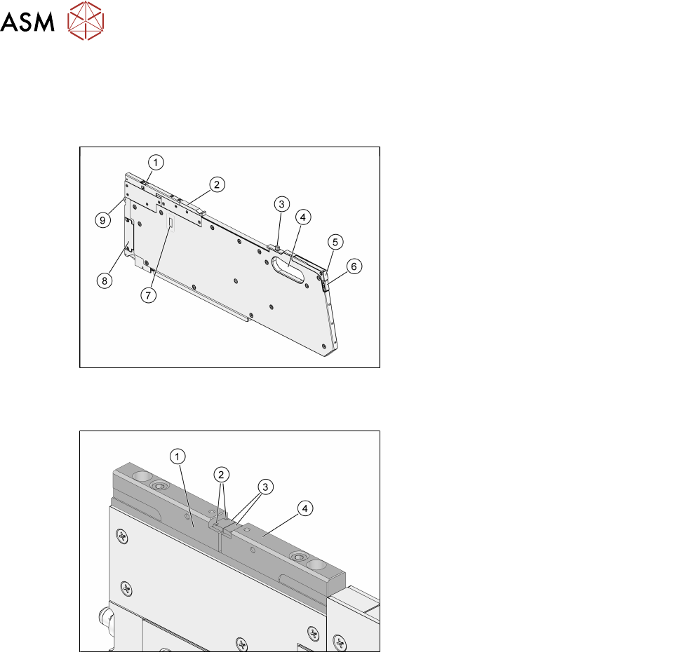 3 功能描述和设计 3.2 设计 16 用户手册 SIPLACE MeasuringFeeder X 03/2020 3.2 设计 3.2.1 概览 1. 带接触板的测量位置 2. 保护盖 3. 后对中销 4. 提把 5. 状态 LED 6. 移除握柄 7. 校准模块接口 8. EDIF (能量和数据接口) 9. 前对中销 3.2.2 接触模块 1. 接触板支架 2. 基准点 3. 接触板 4. 接触板支架 接触模块由手动保护盖保护,如…