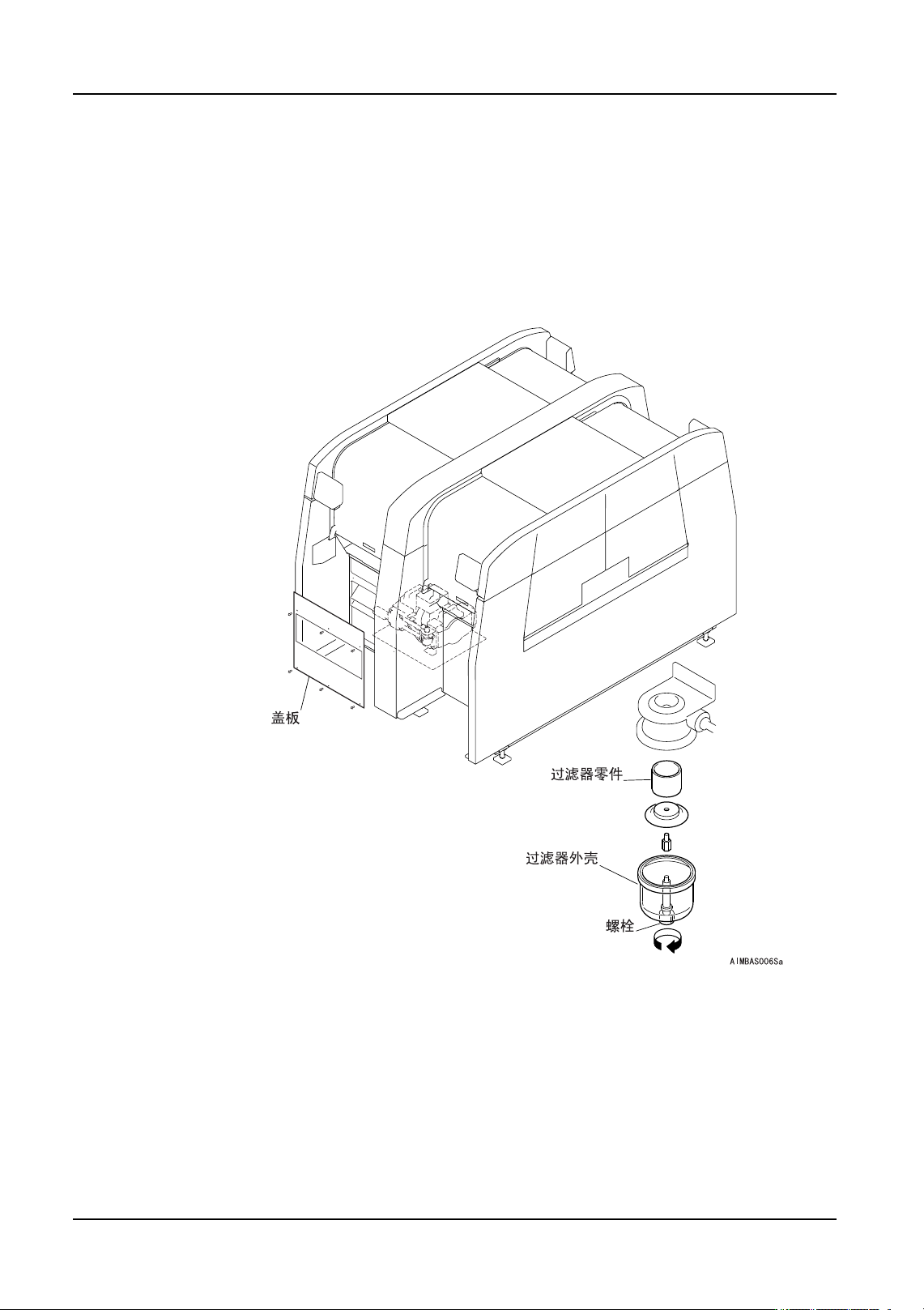 6. 预防保养 QD053-07 126 AIM 机械手册 6.8.2 真空泵过滤器的清扫 1. 将真空管道内设定为大气压。 2. 从本体上拆除盖板。 3. 拧松螺栓,拆下过滤器外壳。 4. 用中性洗涤剂洗涤过滤器外壳。 5. 使用压缩空气吹气清扫滤器外壳,污垢严 重时,请与新品更换。 Side 2
