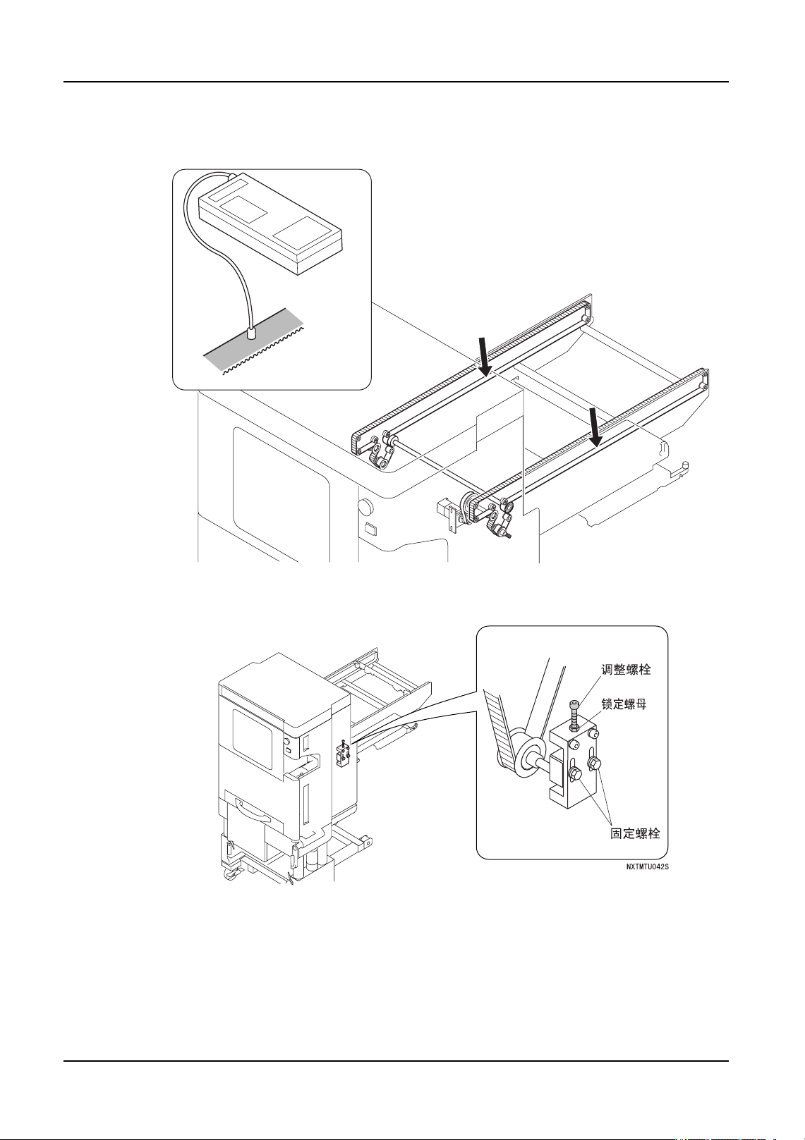 2. 测定值超过上述的范围时请调整皮带张力。拧松固定螺栓后旋转调整螺栓进行调整。