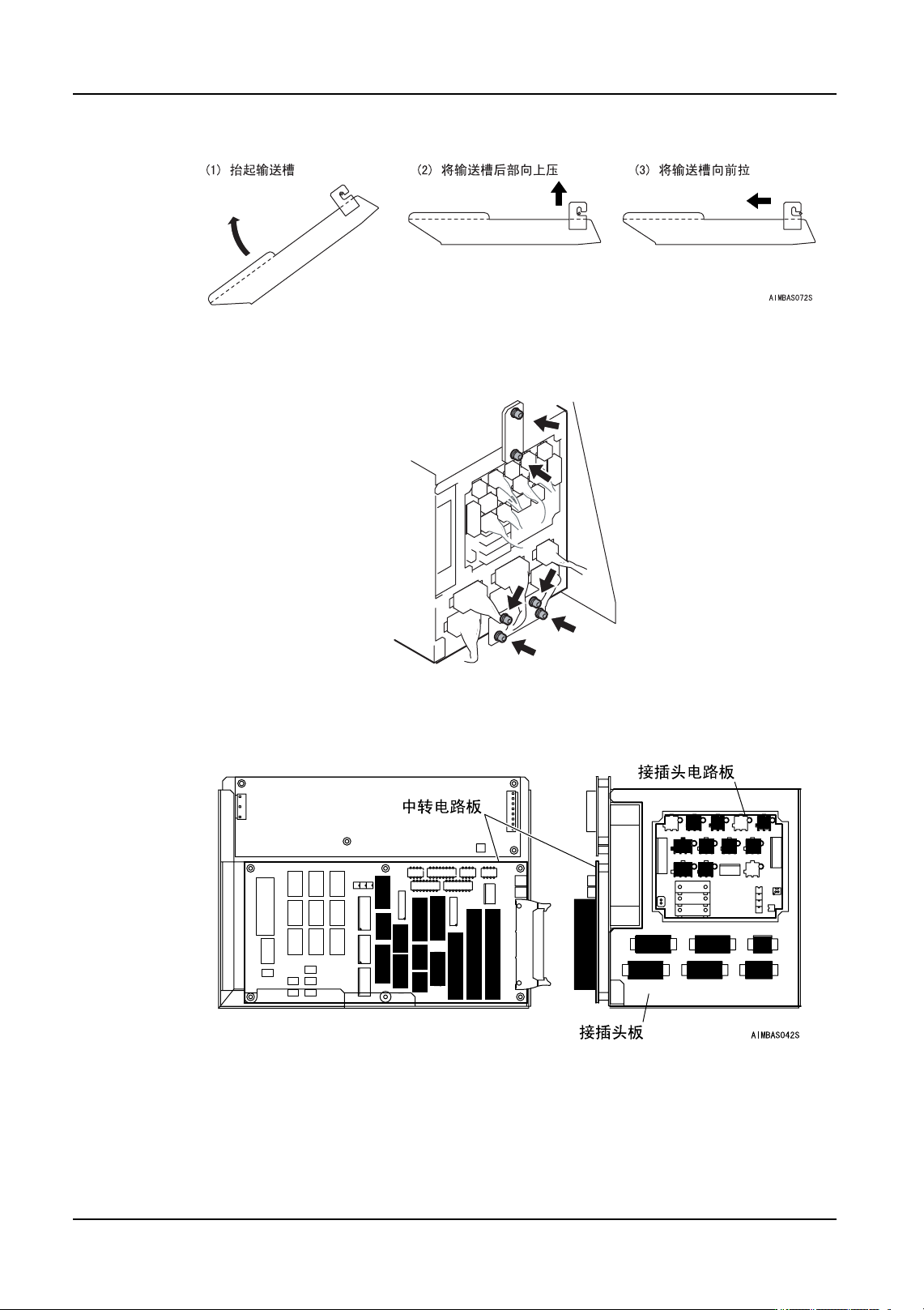 QD053-07 8. 部件的更换 AIM 机械手册 217 8.7 模组 CPU 箱的更换 模组 CPU 箱内存 在各个模组的前侧下部。 8.7.1 必要工具 十字形螺丝刀,六角扳手 (2.5,3,4mm) 。 8.7.2 操作时间 15 分种。( 单侧 模组。) 8.7.3 更换方法 1. 将主电源开关 OFF,切断机 器的电源。 2. 取下机器前侧的盖板。 警告 在进行更换操作时,请务必在 切断电源后进行。 注意 · 连接电缆的插…