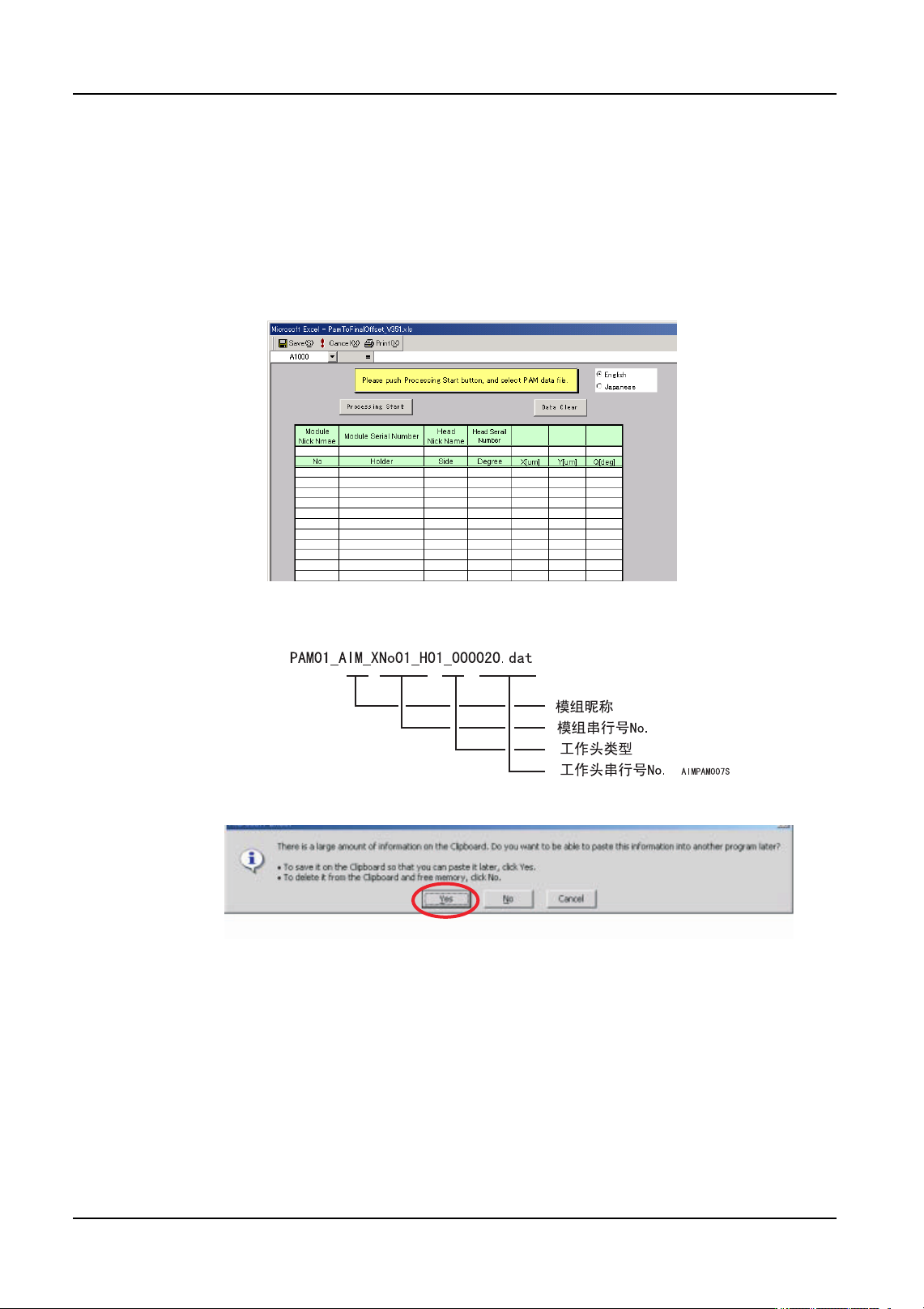 9. 传感器的调整 QD053-07 250 AIM 机械手册 9.1.7 补正贴装精度 ( 最 终修正值反映方式 ) 创建运算数据 1. 请打开应用程序 CD 内收存的 PAM 数据计算 Excal 文件夹 ·:\Documents\PAM\ PamToFinalOff set_v***.xls 备注 )打开文件时,请选择 「使宏有效」按键。 2. 使用选择的语言后,按下 「开始运算」键,请选择测定的 PAM.dat 文件。 备注 )…