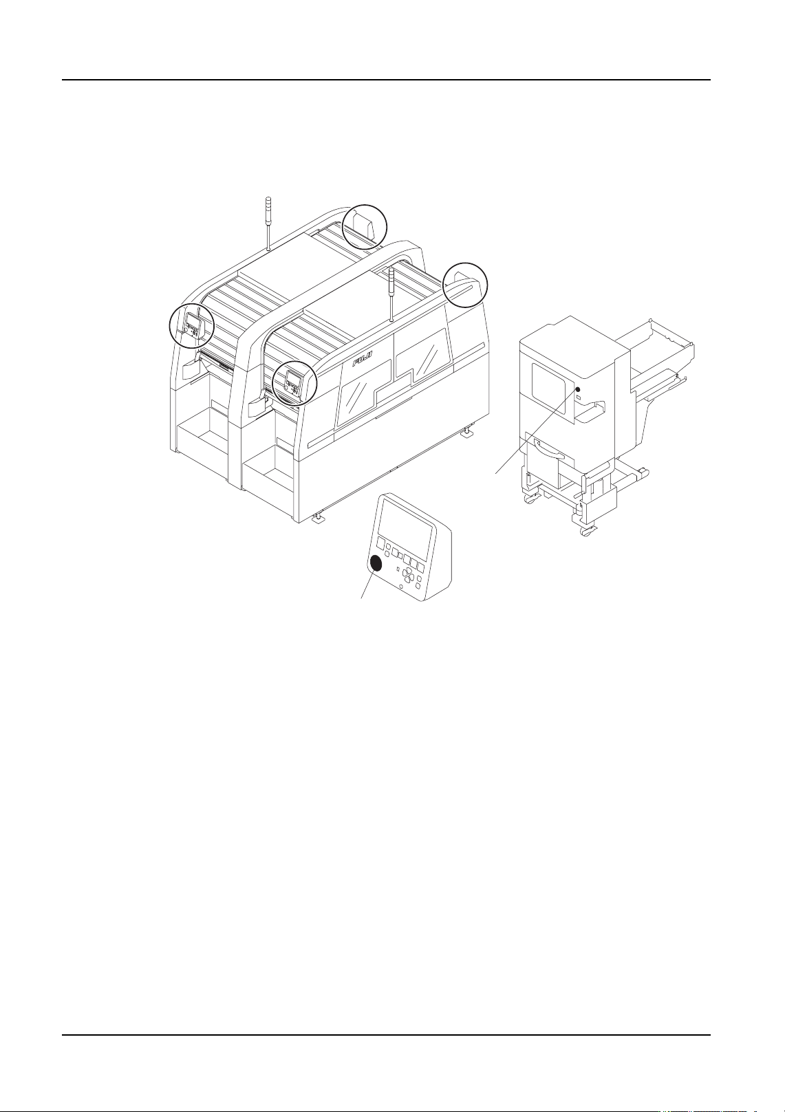 发生紧急情况时,请按下机器上红色的紧急停止按钮停止机器运转。紧急停止按钮的位置请