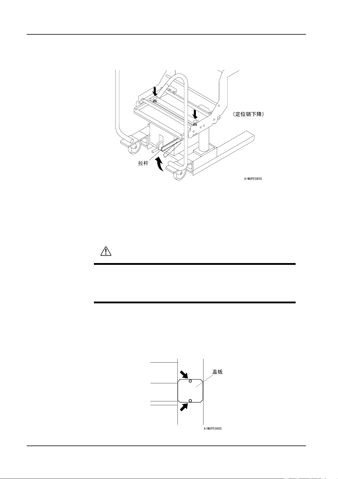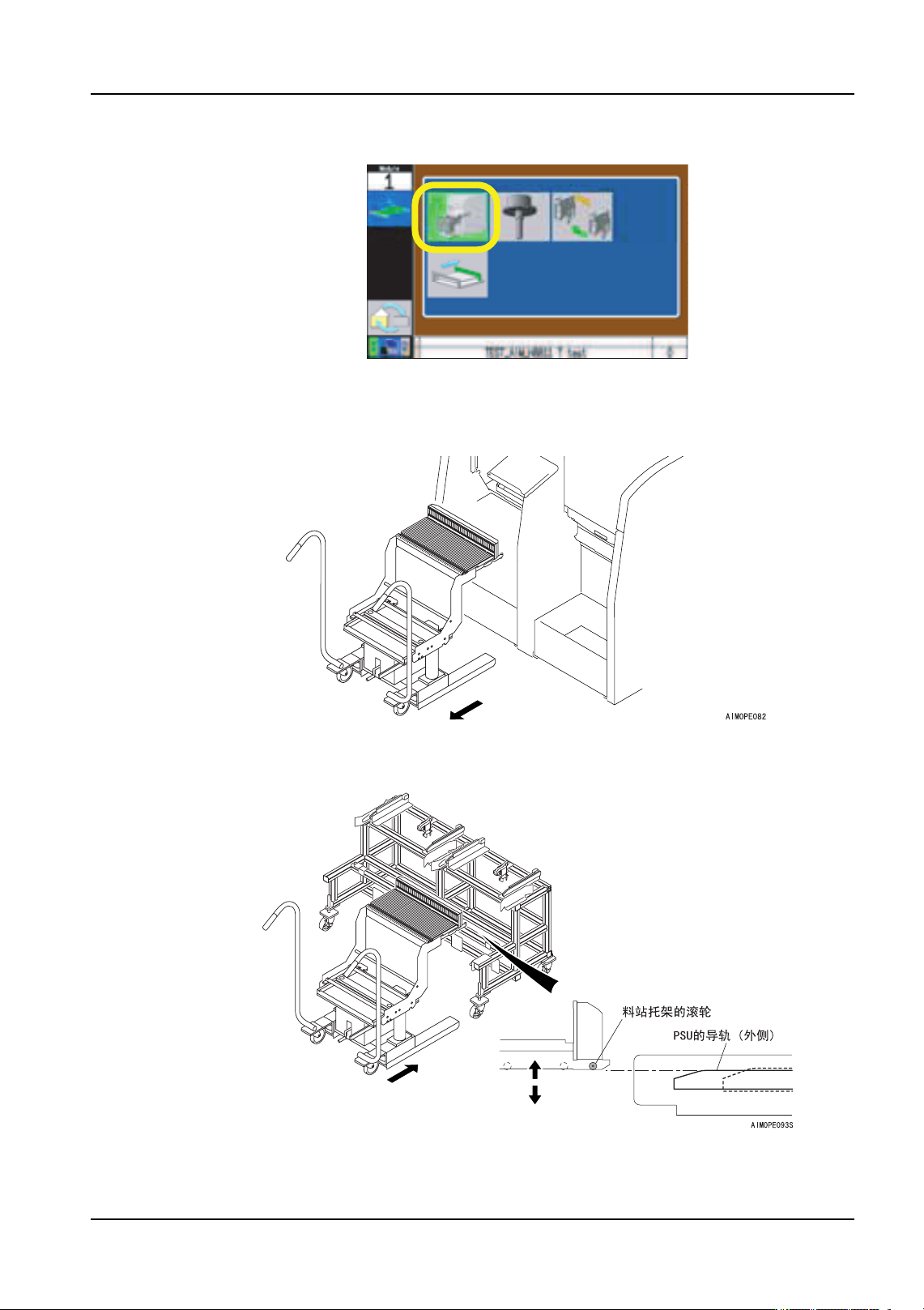 5. 基本操作 QD053-07 58 AIM 机械手册 9. 将 PCU 的拉杆抬起,松开 料盘托架。 注意 )PCU 如果不紧紧地压入模组内就不能进行手柄的操作。 10.慢慢地拉出 PCU,将 其从料站托架上 脱离。 锁定脚轮使 PCU 不 要随意移动。 电源 OFF 时的料站托架的拆除 因为不能使用机上编辑, 所以将 PC U 安装在料站托架上后, 用手动将机器一侧的锁定 解除并 拆除。 拆除步骤根据机器的串行号 N o. 不同。…