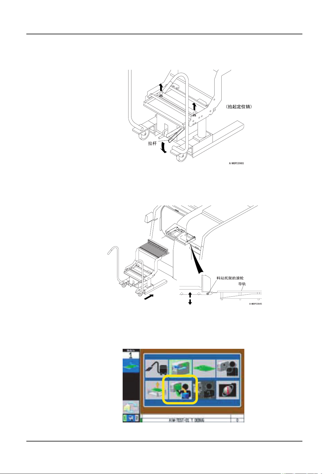 QD053-07 5. 基本操作 AIM 机械手册 65 c. 按下箭头键,选择更换托架指令。 d. 按下 「OK」按钮。 9. 将 PCU 的拉杆抬起,松开 料盘托架。 注意 )PCU 如果不紧紧地压入模组内就不能进行手柄的操作。 10.慢慢地拉出 PCU,将 其从料站托架上 脱离。 11.锁定脚轮使 PCU 不要 随意移动。 12.将废料带箱安装到 机器上。 02SYS-0157
