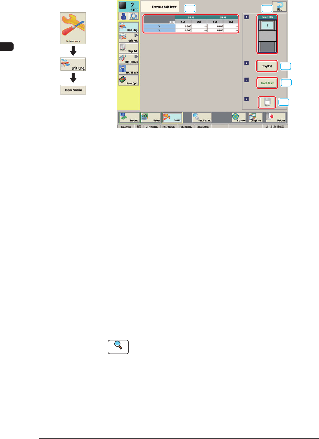 7OM-1603 Chapter 3 : 1. Maintenance Menu 3-7 • The marking-off on the unit on the traverse cart side should agree with that on the elevator unit side. Combined view of the units on the elevator side and traverse cart sid…