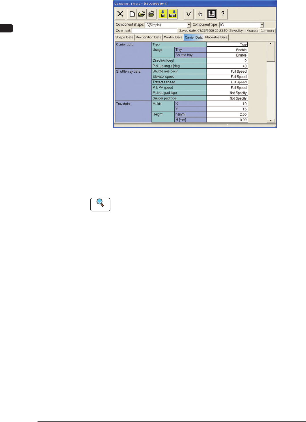 7OM-1603 2-24 Chapter 2 : 2. Menus for Automatic Operation 2.4.5 "Component Library" Window "Carrier Data" Tab sheet F7B19 Carrier Data This is a tab sheet which corresponds to all component shapes - …
