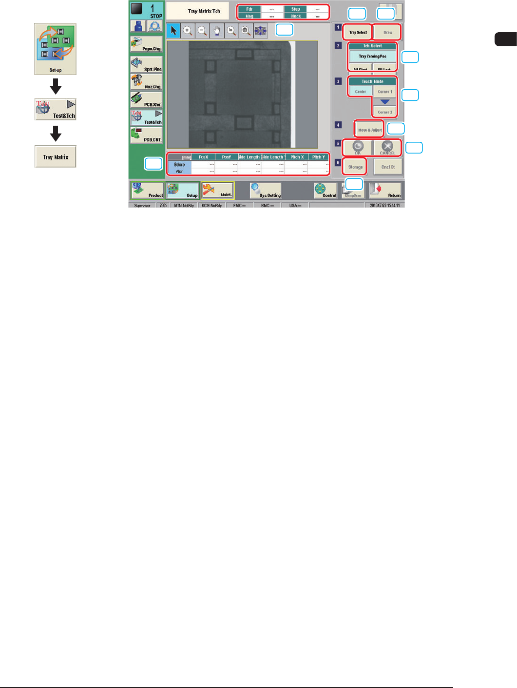 7OM-1603 Chapter 2 : 3. Product Change Menu 2-29 3.2.1 "Tray Matrix T ch" Window The tray matrix teaching operation is performed in this window. [1] [2] [3] [4] [5] [6] [7] [9] [8] [2] [2] [2] "Tray Matrix…