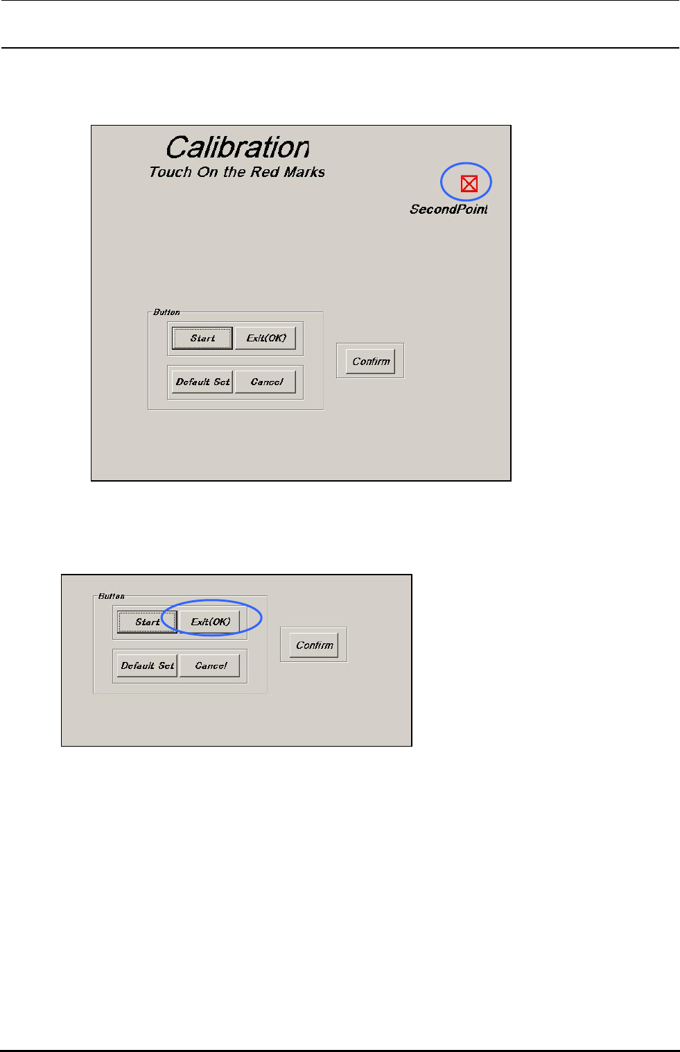Rev1.00 维修调整要领书 12-4 7 ) 请在下面再点击一次“ Calibration ”。 8 ) 请按下“ Confirm ”按钮。 9 ) “ ConfirmPoint ”被显示出来所以请用指尖同校准点一样地按下。 如果按了标记中央以外的话请先按“ Exit ( OK )”按钮,然后从 7 )开始重新进行操作。 如果即使按了标记中央,还是显示黄 色的点与红色的点错位的话,请先按“ Exit ( OK )”按钮, 然后从 3…